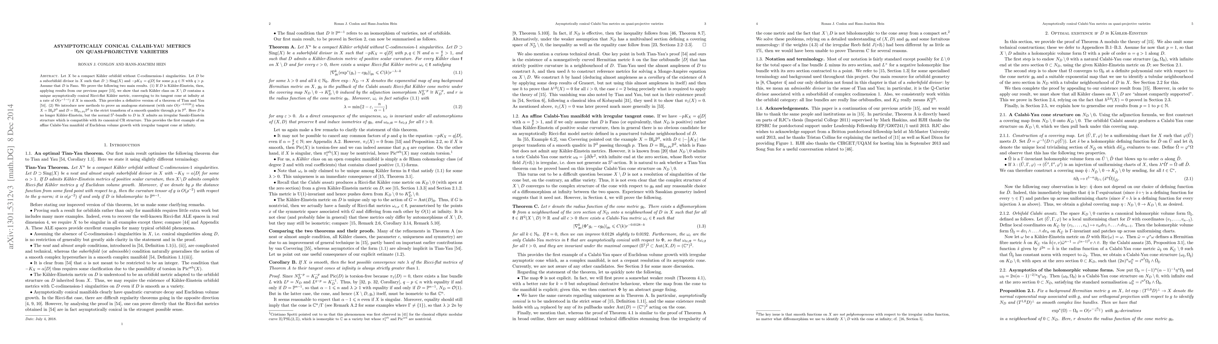 This paper proves the existence of unique asymptotically conical Ricci-flat Kahler metrics on certain Calabi-Yau varieties, resolving a long-standing theorem in geometry.