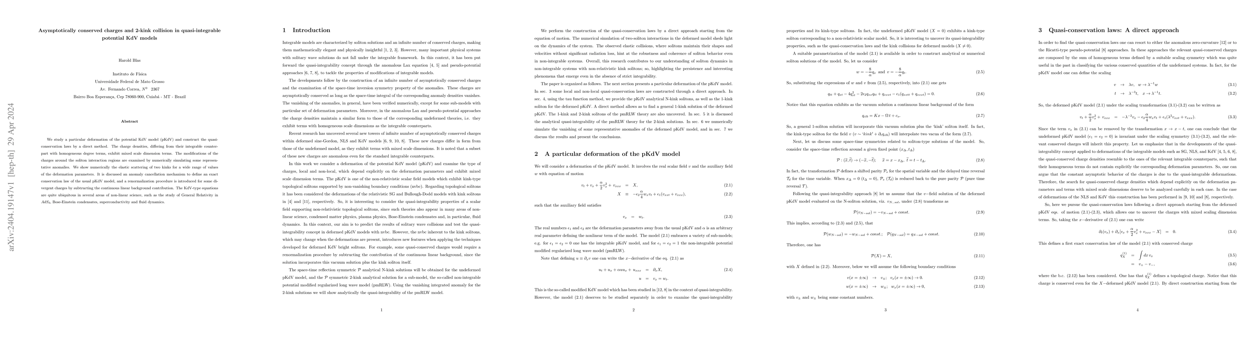 This paper investigates a deformed KdV model (pKdV) and constructs quasi-conservation laws, finding mixed scale dimension charge densities differing from integrable models. It demonstrates numerically the elastic scattering of two kinks and introduces a renormalization procedure for divergent charges, discussing an anomaly cancellation mechanism to achieve exact conservation.