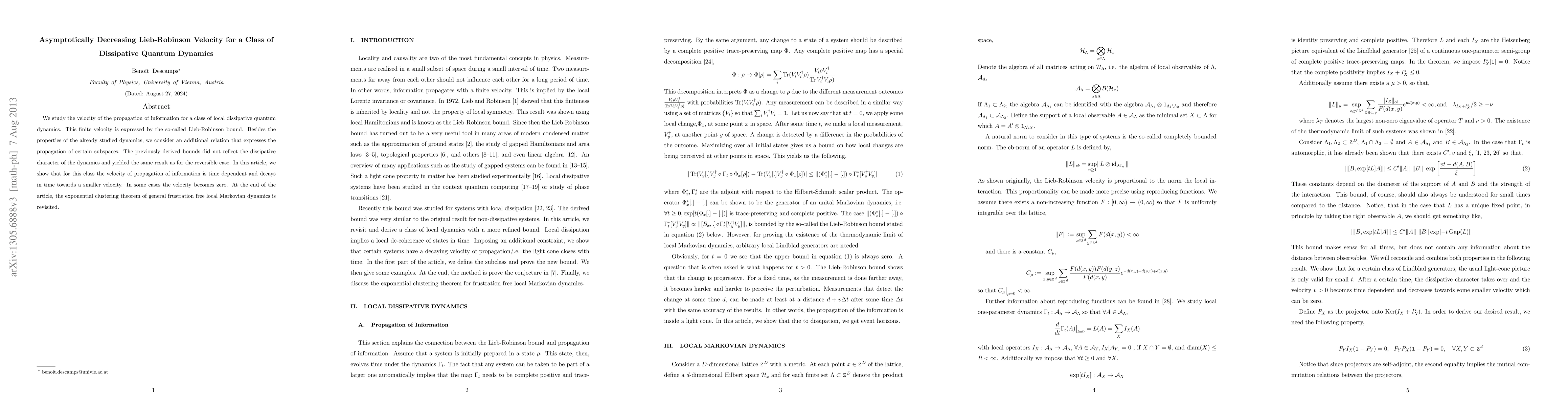 We study the velocity of the propagation of information for a class of local dissipative quantum dynamics. This finite velocity is expressed by the so-called Lieb-Robinson bound. Besides the properties of the already studied dynamics, we consider an additional relation that expresses the propagation of certain subspaces. The previously derived bounds did not reflect the dissipative character of the dynamics and yielded the same result as for the reversible case. In this article, we show that for this class the velocity of propagation of information is time dependent and decays in time towards a smaller velocity. In some cases the velocity becomes zero. At the end of the article, the exponential clustering theorem of general frustration free local Markovian dynamics is revisited.