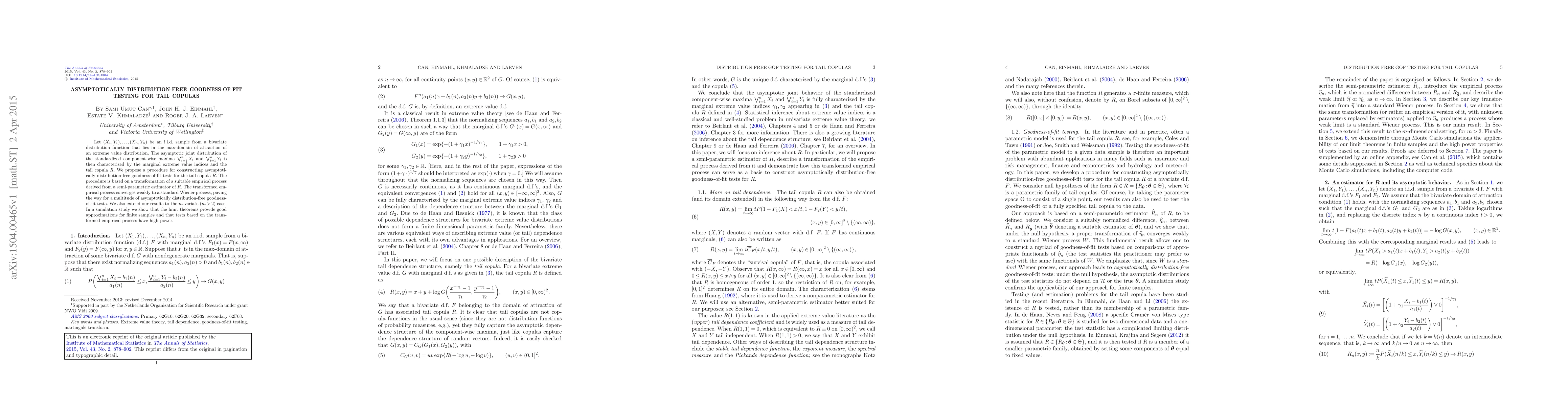 Let $(X_1,Y_1),\ldots,(X_n,Y_n)$ be an i.i.d. sample from a bivariate distribution function that lies in the max-domain of attraction of an extreme value distribution. The asymptotic joint distribution of the standardized component-wise maxima $\bigvee_{i=1}^nX_i$ and $\bigvee_{i=1}^nY_i$ is then characterized by the marginal extreme value indices and the tail copula $R$. We propose a procedure for constructing asymptotically distribution-free goodness-of-fit tests for the tail copula $R$. The procedure is based on a transformation of a suitable empirical process derived from a semi-parametric estimator of $R$. The transformed empirical process converges weakly to a standard Wiener process, paving the way for a multitude of asymptotically distribution-free goodness-of-fit tests. We also extend our results to the $m$-variate ($m>2$) case. In a simulation study we show that the limit theorems provide good approximations for finite samples and that tests based on the transformed empirical process have high power.