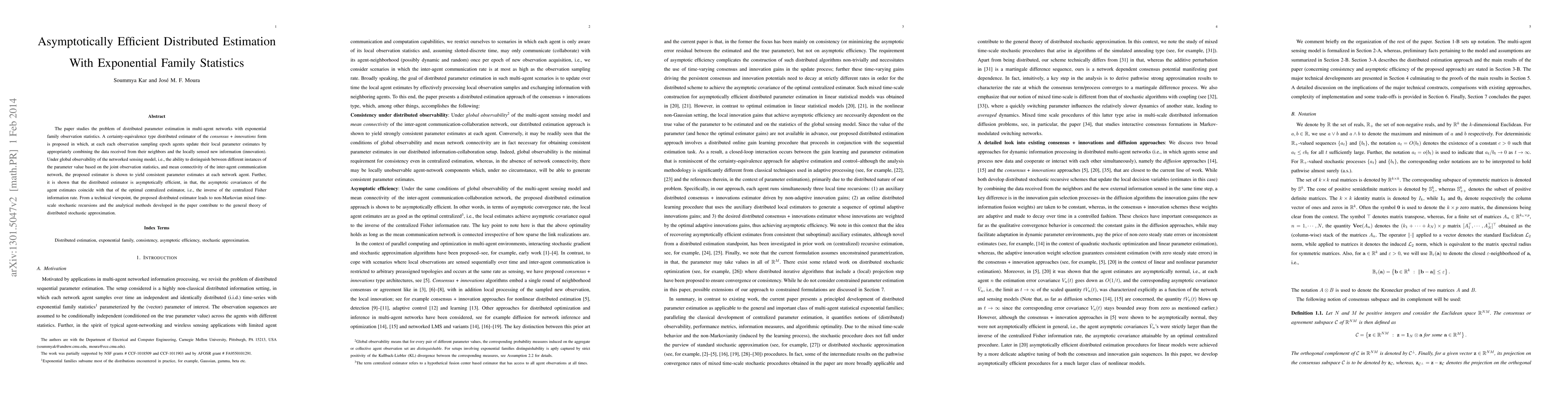 This paper proposes a distributed estimator for multi-agent networks observing exponential family statistics, achieving consensus and innovation updates. Under global observability and mean connectivity, the estimator is shown to be consistent and asymptotically efficient, matching the optimal centralized estimator's covariance.
