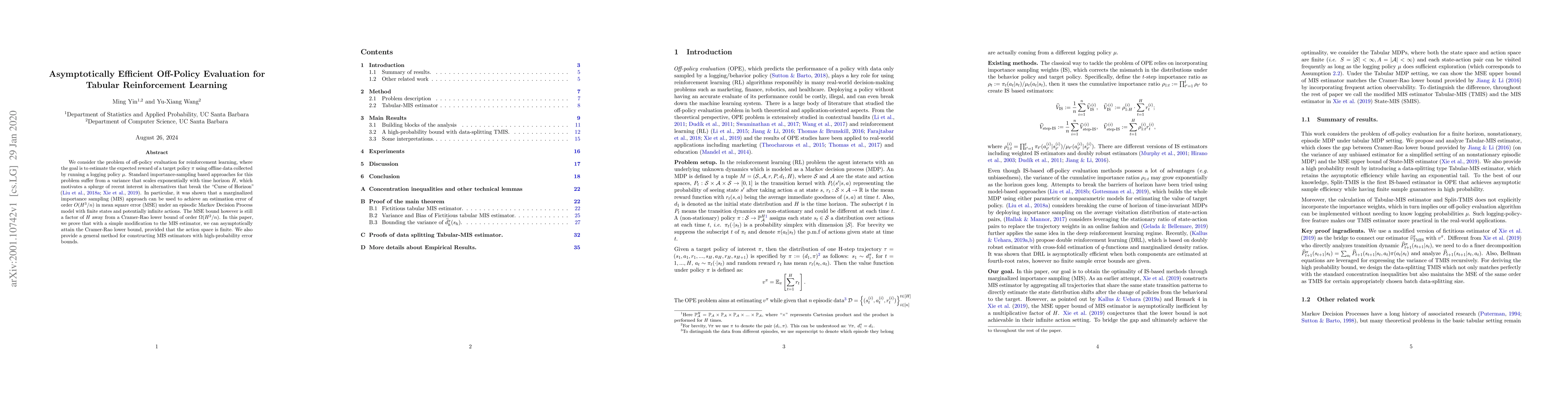 This paper proposes an improved marginalized importance sampling (MIS) approach to achieve asymptotically efficient off-policy evaluation in tabular reinforcement learning, reducing the estimation error to match the Cramer-Rao lower bound for finite action spaces. It also presents a general method for constructing MIS estimators with high-probability error bounds.