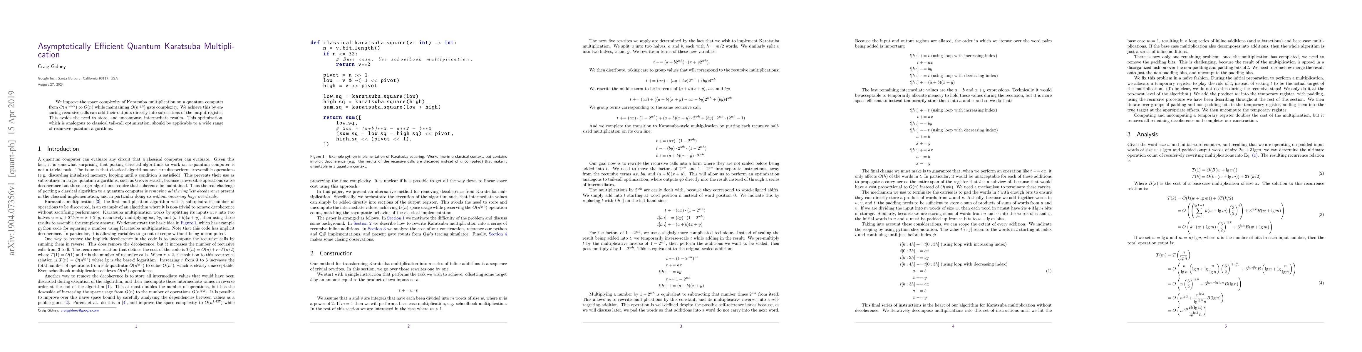 This research optimizes quantum Karatsuba multiplication, reducing space complexity from O(n^1.427) to O(n) while keeping gate complexity at O(n^log3). It achieves this by allowing recursive calls to directly add outputs to the output register, eliminating intermediate storage, akin to classical tail-call optimization. This method could broadly benefit other recursive quantum algorithms.