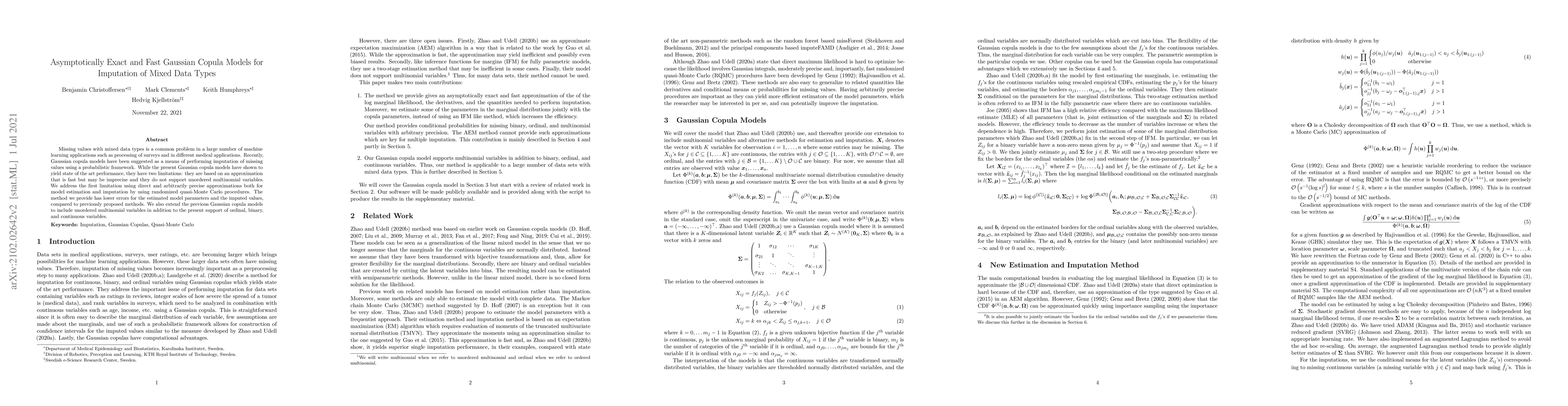 This paper proposes asymptotically exact and fast Gaussian copula models for imputation of mixed data types, addressing the limitations of previous methods by using precise approximations and randomized quasi-Monte Carlo procedures. It also extends the model to include unordered multinomial variables.