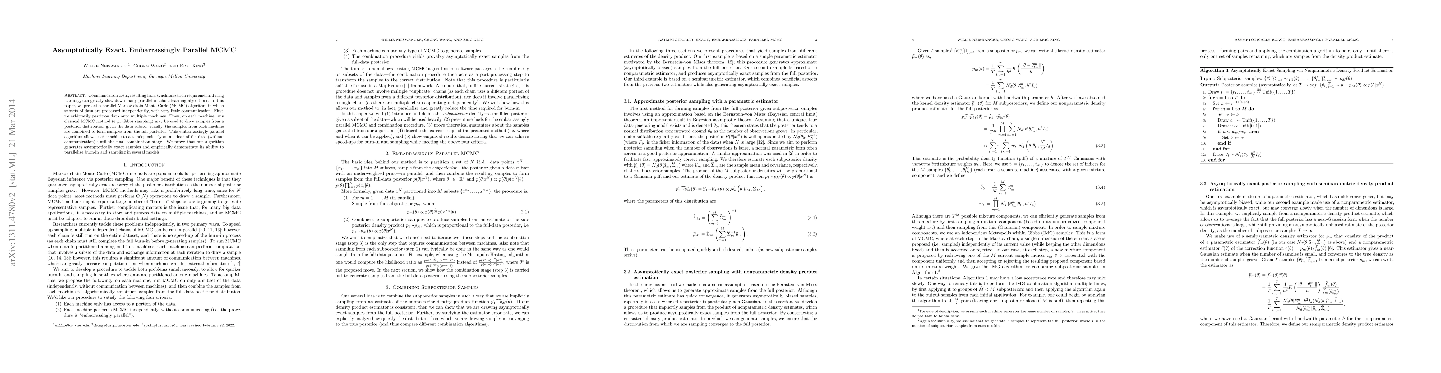 The paper presents a parallel Markov Chain Monte Carlo (MCMC) algorithm that processes subsets of data independently with minimal communication. It partitions data across multiple machines, uses classical MCMC methods on each machine, and combines samples from each machine to form samples from the full posterior.