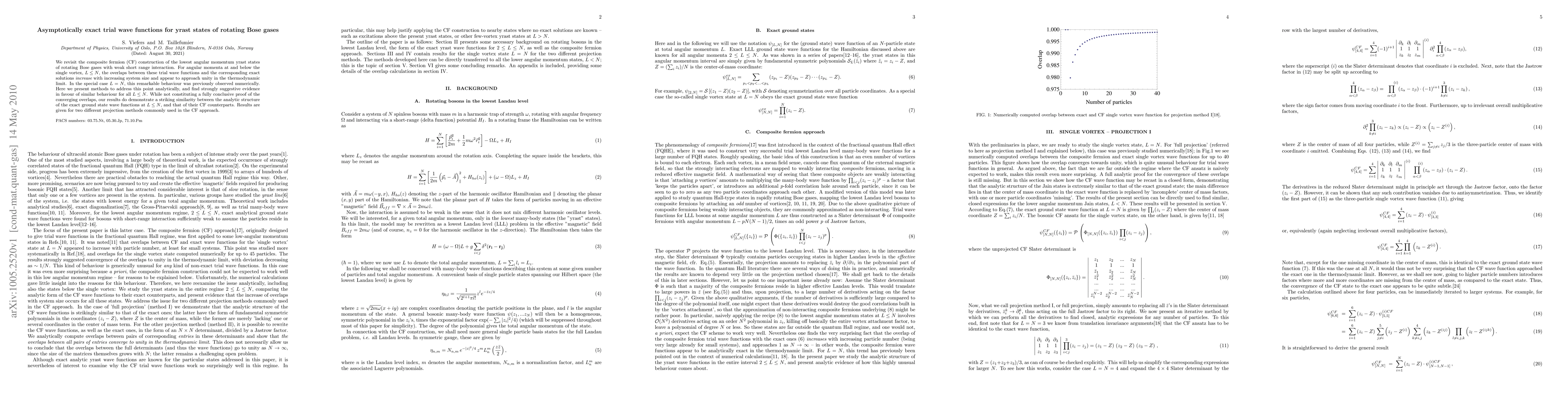 We revisit the composite fermion (CF) construction of the lowest angular momentum yrast states of rotating Bose gases with weak short range interaction. For angular momenta at and below the single vortex, $L \leq N$, the overlaps between these trial wave functions and the corresponding exact solutions {\it increase} with increasing system size and appear to approach unity in the thermodynamic limit. In the special case $L=N$, this remarkable behaviour was previously observed numerically. Here we present methods to address this point analytically, and find strongly suggestive evidence in favour of similar behaviour for all $L \leq N$. While not constituting a fully conclusive proof of the converging overlaps, our results do demonstrate a striking similarity between the analytic structure of the exact ground state wave functions at $L \leq N$, and that of their CF counterparts. Results are given for two different projection methods commonly used in the CF approach.