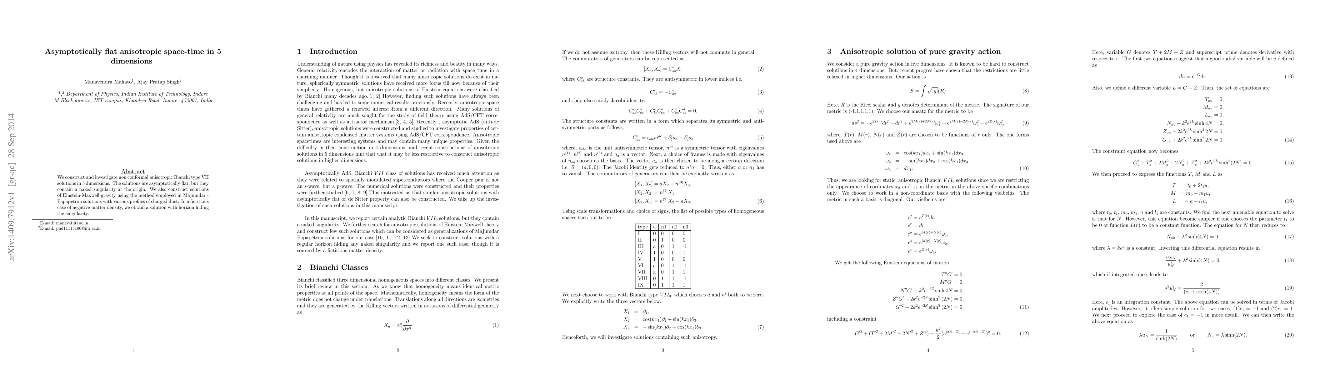 The paper constructs non conformal anisotropic space-time solutions in 5 dimensions, featuring asymptotically flat characteristics and a naked singularity at the origin. It also explores Einstein-Maxwell gravity solutions with charged dust, unveiling a horizon-hiding singularity under a theoretical negative matter density scenario.