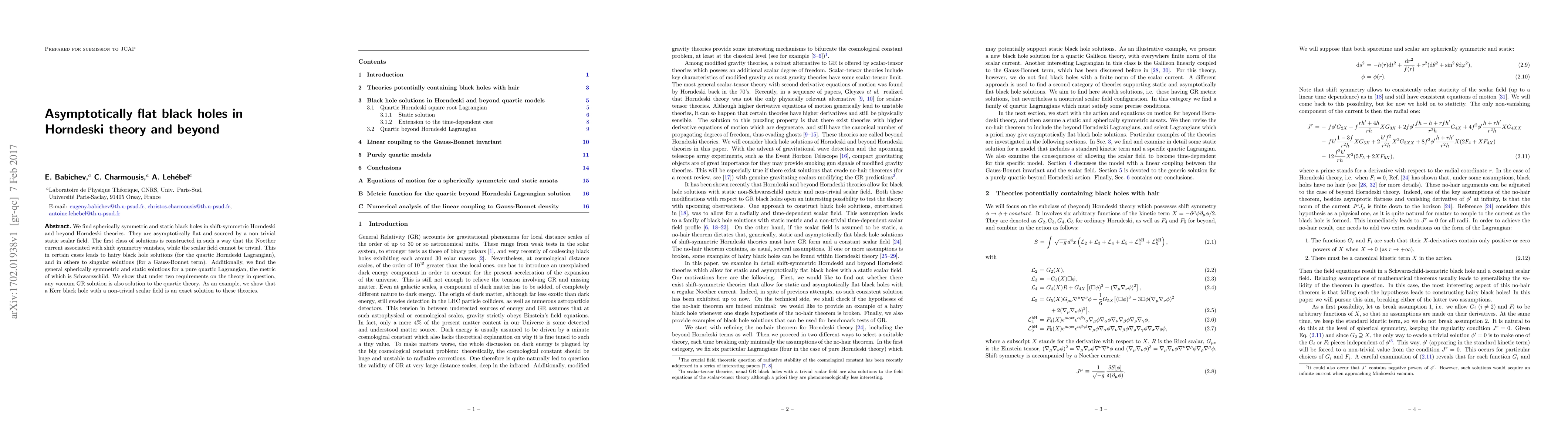 We find spherically symmetric and static black holes in shift-symmetric Horndeski and beyond Horndeski theories. They are asymptotically flat and sourced by a non trivial static scalar field. The first class of solutions is constructed in such a way that the Noether current associated with shift symmetry vanishes, while the scalar field cannot be trivial. This in certain cases leads to hairy black hole solutions (for the quartic Horndeski Lagrangian), and in others to singular solutions (for a Gauss-Bonnet term). Additionally, we find the general spherically symmetric and static solutions for a pure quartic Lagrangian, the metric of which is Schwarzschild. We show that under two requirements on the theory in question, any vacuum GR solution is also solution to the quartic theory. As an example, we show that a Kerr black hole with a non-trivial scalar field is an exact solution to these theories.