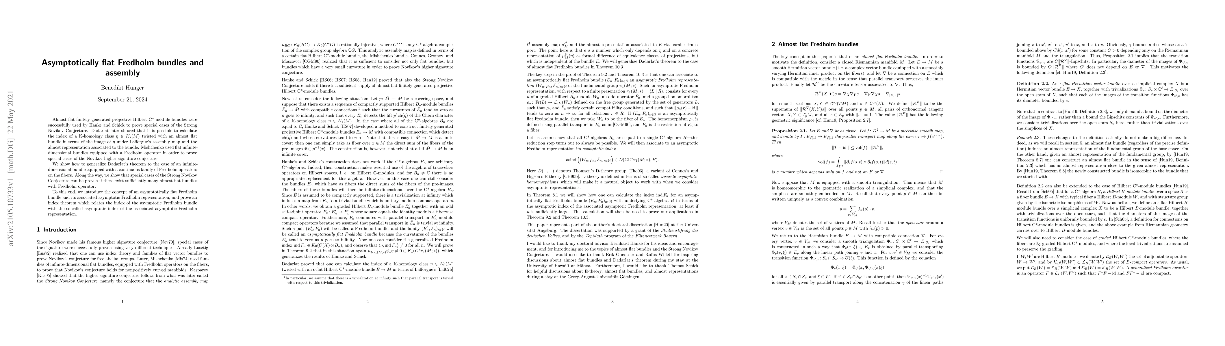 Almost flat finitely generated projective Hilbert C*-module bundles were successfully used by Hanke and Schick to prove special cases of the Strong Novikov Conjecture. Dadarlat later showed that it is possible to calculate the index of a K-homology class $\eta\in K_*(M)$ twisted with an almost flat bundle in terms of the image of $\eta$ under Lafforgue's assembly map and the almost representation associated to the bundle. Mishchenko used flat infinite-dimensional bundles equipped with a Fredholm operator in order to prove special cases of the Novikov higher signature conjecture. We show how to generalize Dadarlat's theorem to the case of an infinite-dimensional bundle equipped with a continuous family of Fredholm operators on the fibers. Along the way, we show that special cases of the Strong Novikov Conjecture can be proven if there exist sufficiently many almost flat bundles with Fredholm operator. To this end, we introduce the concept of an asymptotically flat Fredholm bundle and its associated asymptotic Fredholm representation, and prove an index theorem which relates the index of the asymptotic Fredholm bundle with the so-called asymptotic index of the associated asymptotic Fredholm representation.