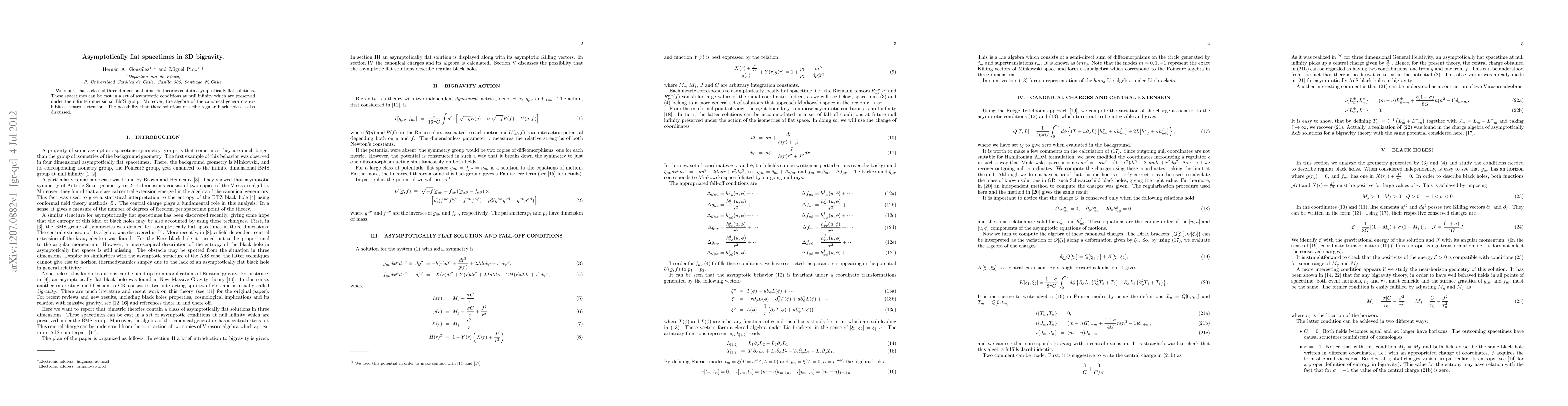 Researchers found asymptotically flat spacetimes in 3D bigravity theories, which can describe regular black holes, and these solutions preserve a key mathematical group.