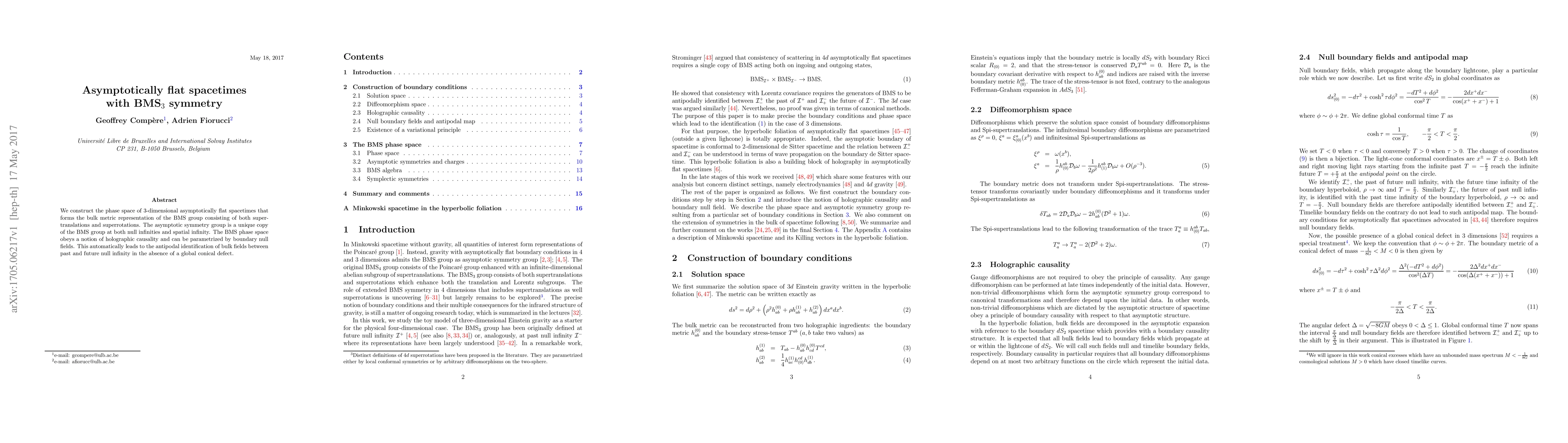 This paper constructs the phase space for 3-dimensional asymptotically flat spacetimes with BMS$_3$ symmetry, identifying a unique BMS group at each infinity. The BMS phase space exhibits holographic causality and is parametrized by boundary null fields, leading to antipodal identification of bulk fields without global conical defects.