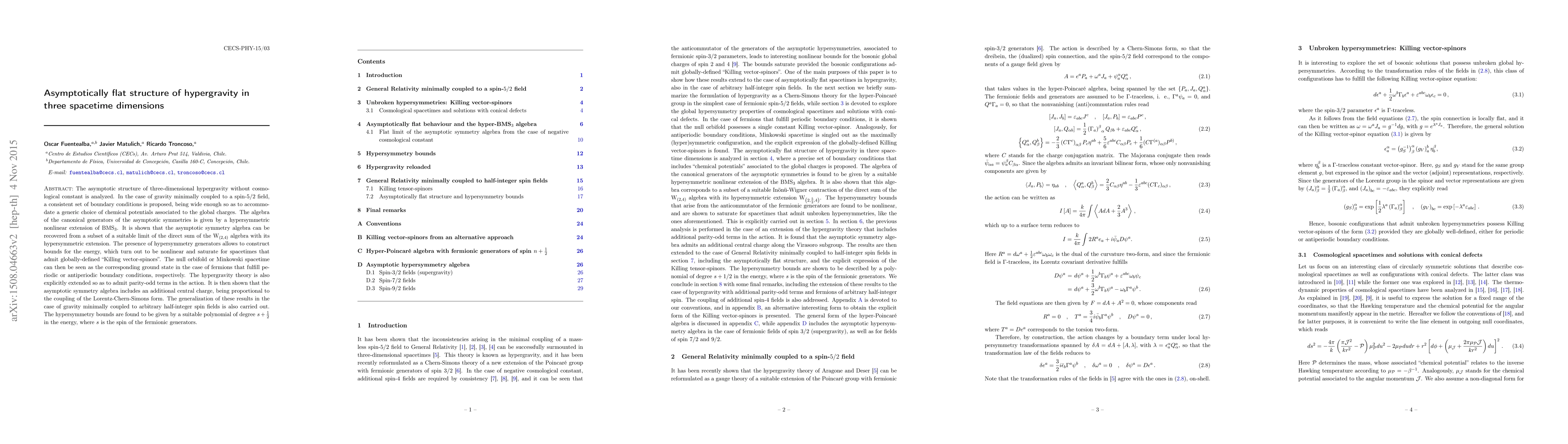 The asymptotic structure of three-dimensional hypergravity without cosmological constant is analyzed. In the case of gravity minimally coupled to a spin-$5/2$ field, a consistent set of boundary conditions is proposed, being wide enough so as to accommodate a generic choice of chemical potentials associated to the global charges. The algebra of the canonical generators of the asymptotic symmetries is given by a hypersymmetric nonlinear extension of BMS$_{3}$. It is shown that the asymptotic symmetry algebra can be recovered from a subset of a suitable limit of the direct sum of the W$_{\left(2,4\right)}$ algebra with its hypersymmetric extension. The presence of hypersymmetry generators allows to construct bounds for the energy, which turn out to be nonlinear and saturate for spacetimes that admit globally-defined "Killing vector-spinors". The null orbifold or Minkowski spacetime can then be seen as the corresponding ground state in the case of fermions that fulfill periodic or anti-periodic boundary conditions, respectively. The hypergravity theory is also explicitly extended so as to admit parity-odd terms in the action. It is then shown that the asymptotic symmetry algebra includes an additional central charge, being proportional to the coupling of the Lorentz-Chern-Simons form. The generalization of these results in the case of gravity minimally coupled to arbitrary half-integer spin fields is also carried out. The hypersymmetry bounds are found to be given by a suitable polynomial of degree $s+\frac{1}{2}$ in the energy, where $s$ is the spin of the fermionic generators.