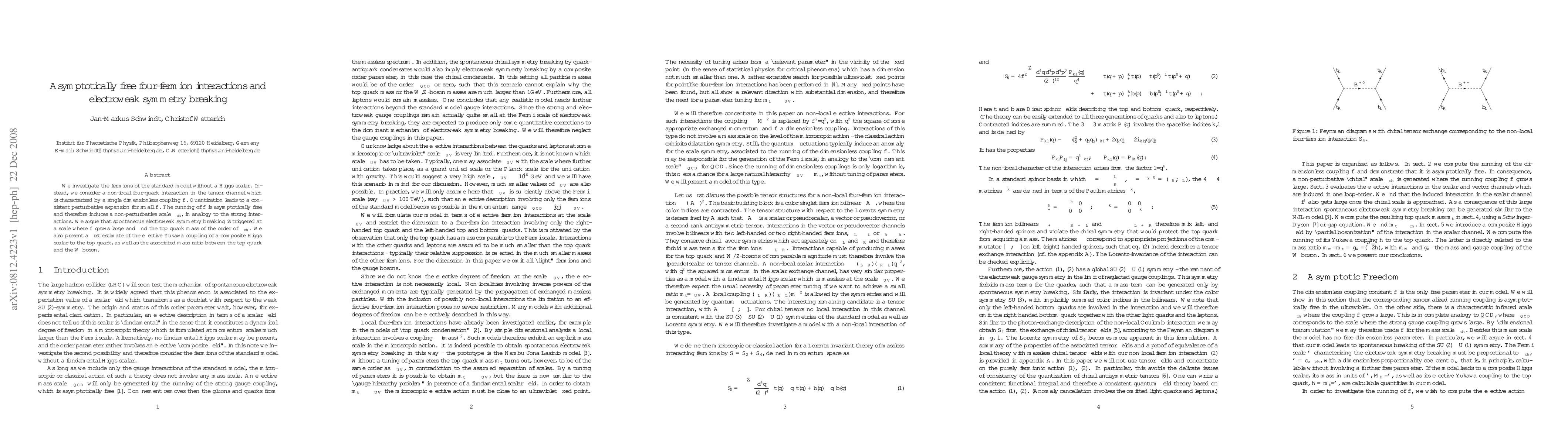 We investigate the fermions of the standard model without a Higgs scalar. Instead, we consider a non-local four-quark interaction in the tensor channel which is characterized by a single dimensionless coupling $f$. Quantization leads to a consistent perturbative expansion for small $f$. The running of $f$ is asymptotically free and therefore induces a non-perturbative scale $\Lambda_{ch}$, in analogy to the strong interactions. We argue that spontaneous electroweak symmetry breaking is triggered at a scale where $f$ grows large and find the top quark mass of the order of $\Lambda_{ch}$. We also present a first estimate of the effective Yukawa coupling of a composite Higgs scalar to the top quark, as well as the associated mass ratio between the top quark and the W boson.