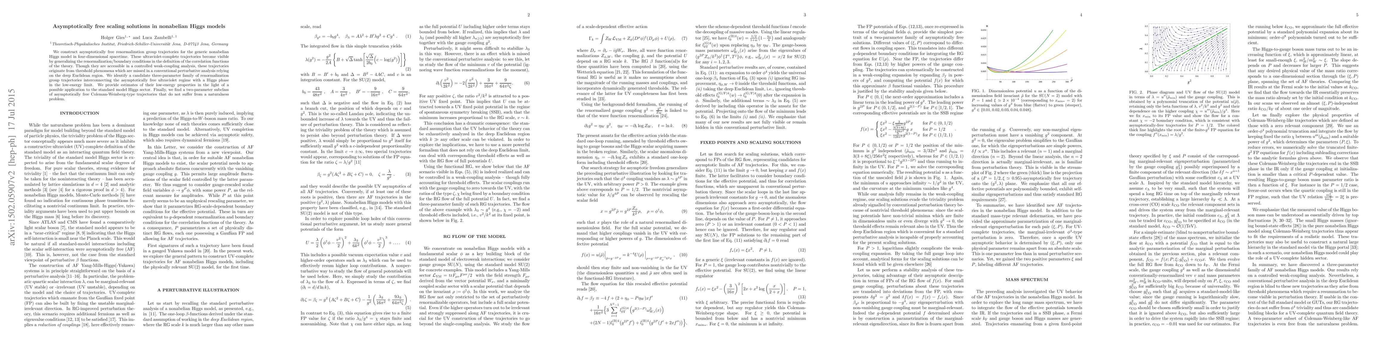 We construct asymptotically free renormalization group trajectories for the generic nonabelian Higgs model in four-dimensional spacetime. These ultraviolet-complete trajectories become visible by generalizing the renormalization/boundary conditions in the definition of the correlation functions of the theory. Though they are accessible in a controlled weak-coupling analysis, these trajectories originate from threshold phenomena which are missed in a conventional perturbative analysis relying on the deep Euclidean region. We identify a candidate three-parameter family of renormalization group trajectories interconnecting the asymptotically free ultraviolet regime with a Higgs phase in the low-energy limit. We provide estimates of their low-energy properties in the light of a possible application to the standard model Higgs sector. Finally, we find a two-parameter subclass of asymptotically free Coleman-Weinberg-type trajectories that do not suffer from a naturalness problem.