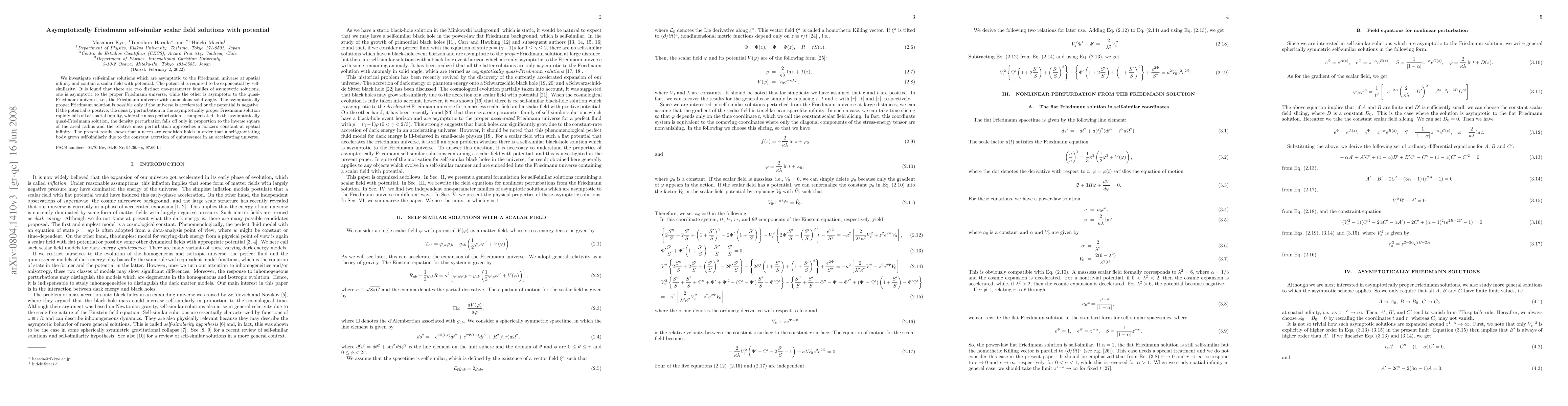 This paper explores self-similar scalar field solutions asymptotic to the Friedmann universe, revealing two distinct one-parameter families: one resembling a proper Friedmann universe and the other a quasi-Friedmann universe. The proper solution requires an accelerated universe or a negative potential, while the quasi-Friedmann solution shows density perturbations decaying inversely with the square of the areal radius.