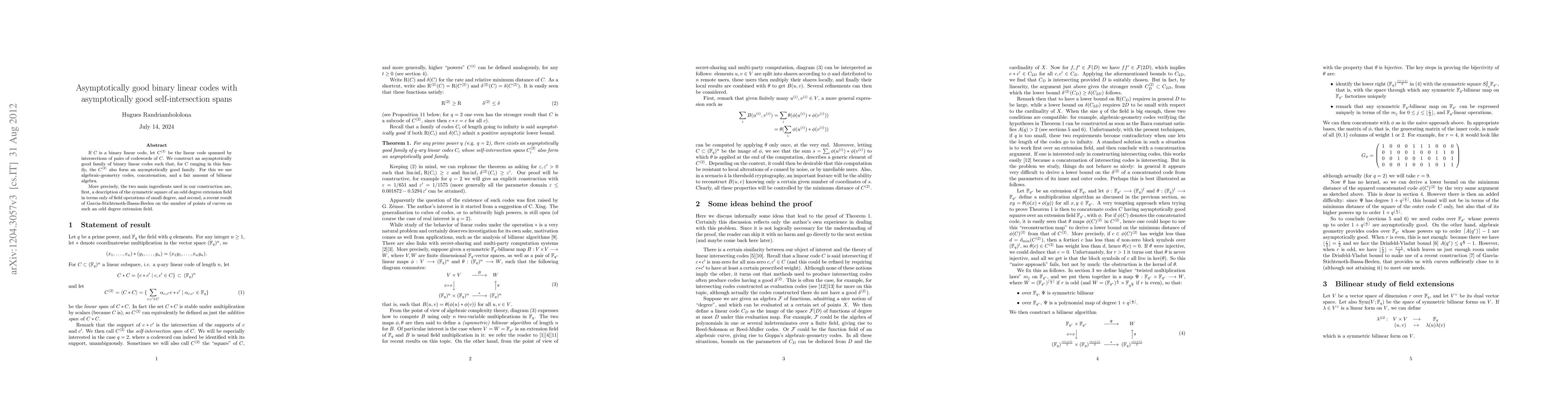 If C is a binary linear code, let C^2 be the linear code spanned by intersections of pairs of codewords of C. We construct an asymptotically good family of binary linear codes such that, for C ranging in this family, the C^2 also form an asymptotically good family. For this we use algebraic-geometry codes, concatenation, and a fair amount of bilinear algebra. More precisely, the two main ingredients used in our construction are, first, a description of the symmetric square of an odd degree extension field in terms only of field operations of small degree, and second, a recent result of Garcia-Stichtenoth-Bassa-Beelen on the number of points of curves on such an odd degree extension field.
