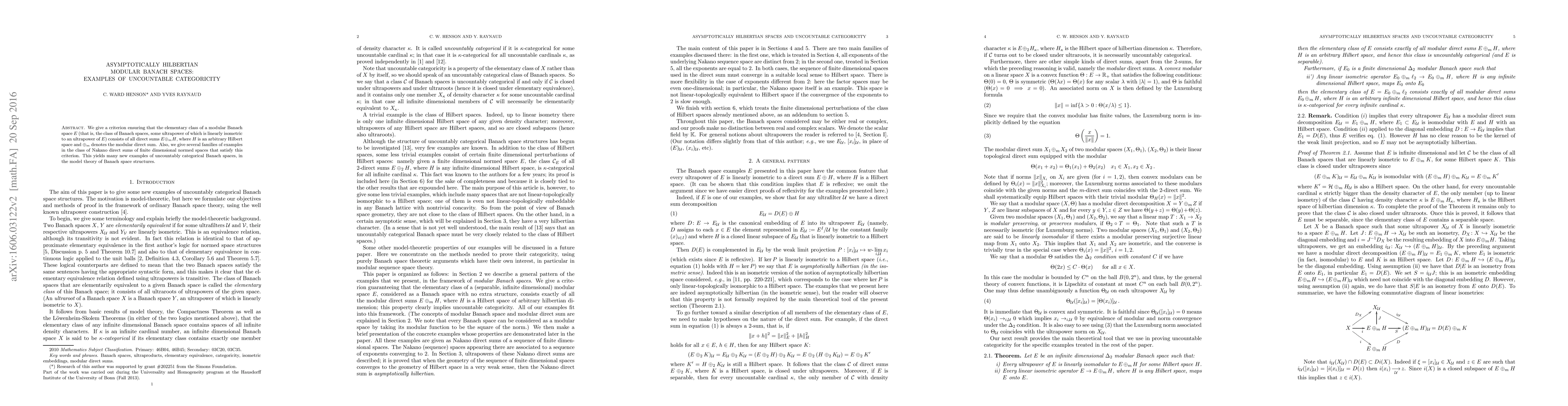 We give a criterion ensuring that the elementary class of a modular Banach space E (that is, the class of Banach spaces, some ultrapower of which is linearly isometric to an ultrapower of E) consists of all direct sums E\oplus_m H, where H is an arbitrary Hilbert space and \oplus_m denotes the modular direct sum. Also, we give several families of examples in the class of Nakano direct sums of finite dimensional normed spaces that satisfy this criterion. This yields many new examples of uncountably categorical Banach spaces, in the model theory of Banach space structures.