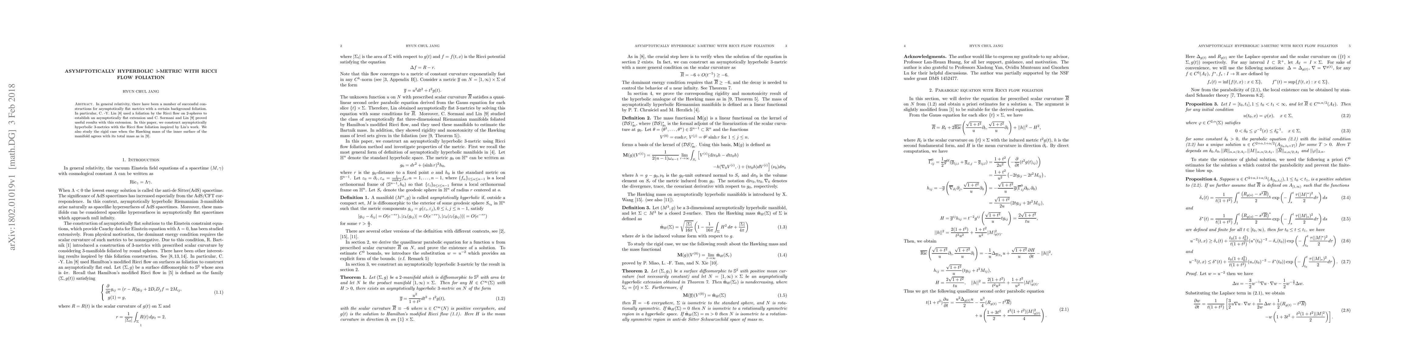 This paper constructs asymptotically hyperbolic 3-metrics using Ricci flow foliation, extending previous work on asymptotically flat metrics. It also examines the rigid case where the inner surface's Hawking mass matches the manifold's total mass.