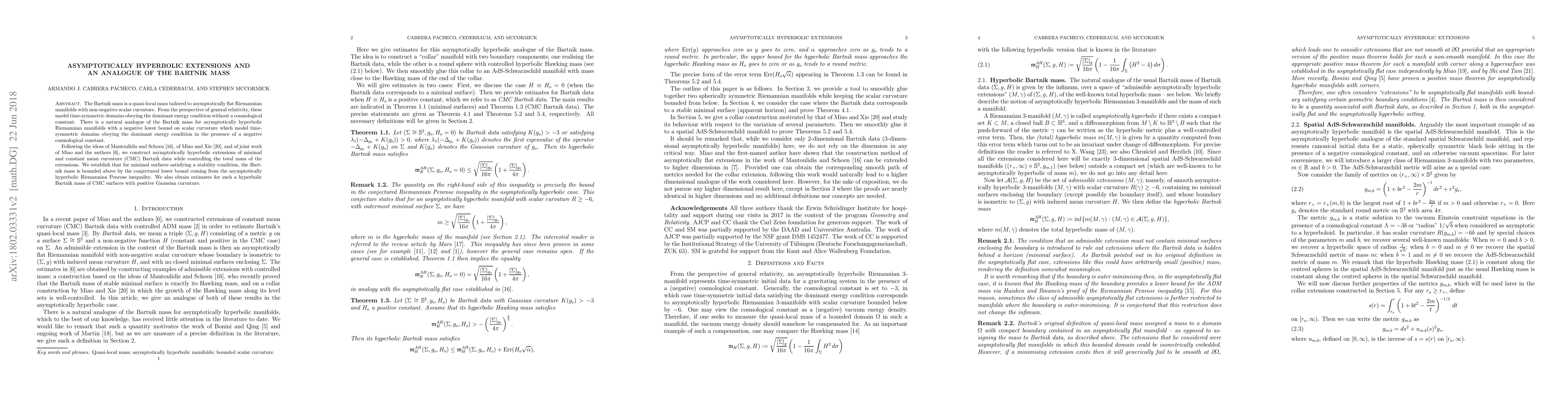 This paper constructs asymptotically hyperbolic extensions of minimal and constant mean curvature surfaces, establishing a Bartnik mass analogue for these manifolds. It shows that the Bartnik mass for stable minimal surfaces is bounded by a conjectured lower bound from the asymptotically hyperbolic Riemannian Penrose inequality.