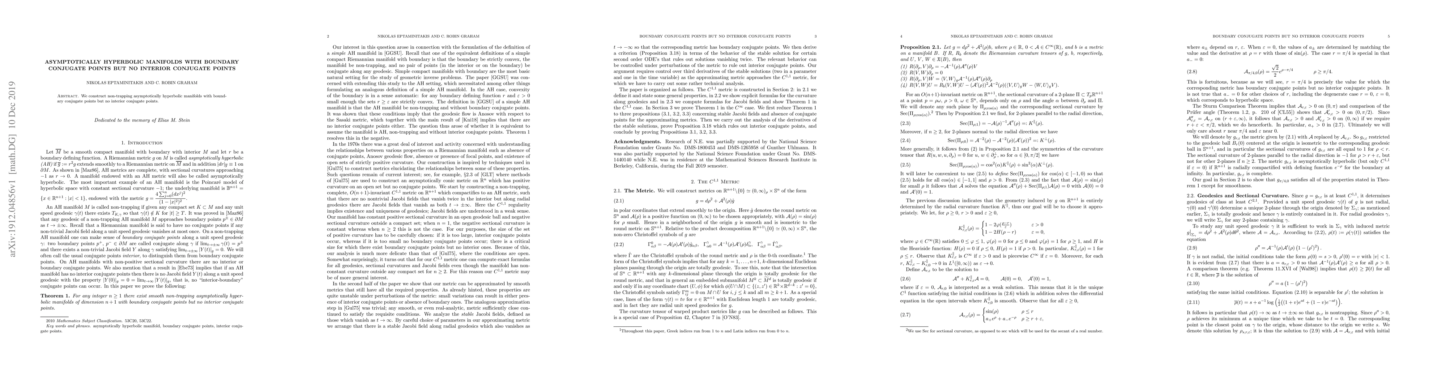 Summary: This paper constructs non-trapping asymptotically hyperbolic manifolds featuring boundary conjugate points while ensuring no interior conjugate points exist, contributing to the understanding of geometric structures in relativity and PDE theory.