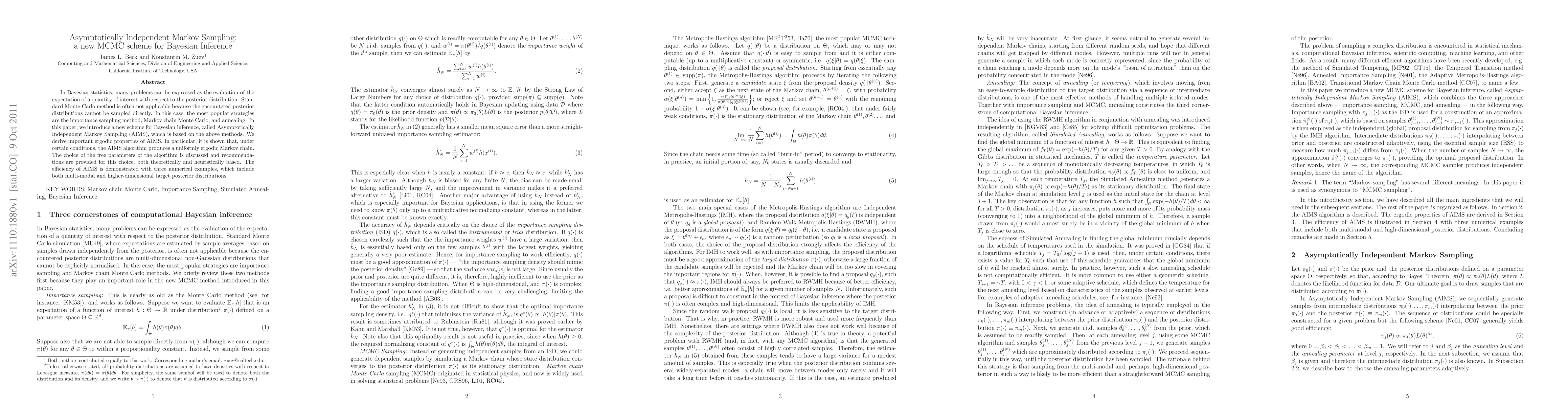 In Bayesian statistics, many problems can be expressed as the evaluation of the expectation of a quantity of interest with respect to the posterior distribution. Standard Monte Carlo method is often not applicable because the encountered posterior distributions cannot be sampled directly. In this case, the most popular strategies are the importance sampling method, Markov chain Monte Carlo, and annealing. In this paper, we introduce a new scheme for Bayesian inference, called Asymptotically Independent Markov Sampling (AIMS), which is based on the above methods. We derive important ergodic properties of AIMS. In particular, it is shown that, under certain conditions, the AIMS algorithm produces a uniformly ergodic Markov chain. The choice of the free parameters of the algorithm is discussed and recommendations are provided for this choice, both theoretically and heuristically based. The efficiency of AIMS is demonstrated with three numerical examples, which include both multi-modal and higher-dimensional target posterior distributions.