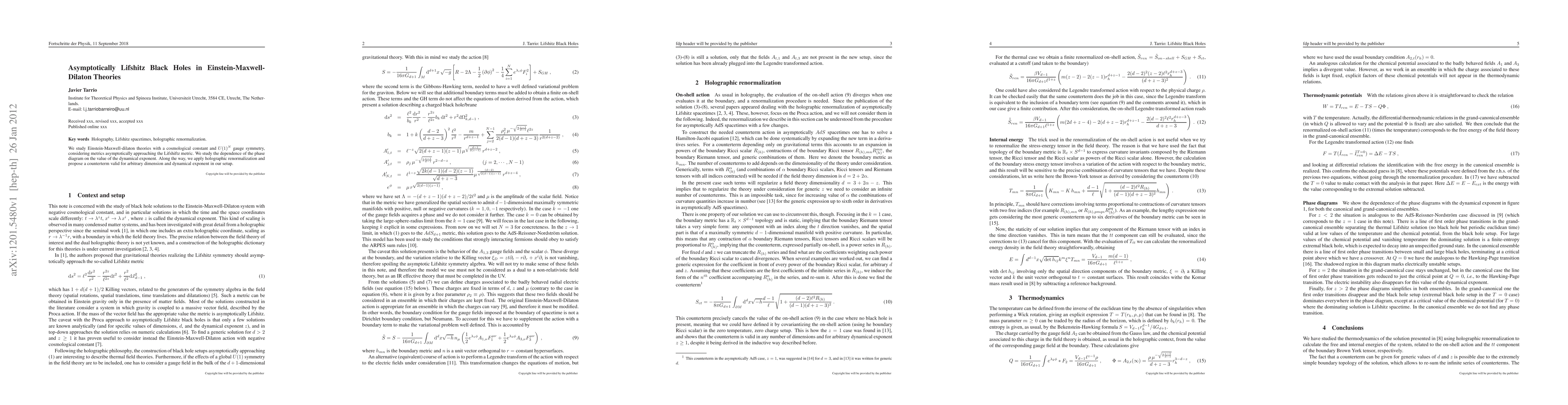 This paper explores Einstein-Maxwell-dilaton theories with U(1)^N gauge symmetry, focusing on metrics asymptotically Lifshitz. It examines the phase diagram's dependence on the dynamical exponent and introduces a holographic renormalization counterterm for arbitrary dimensions and exponents.