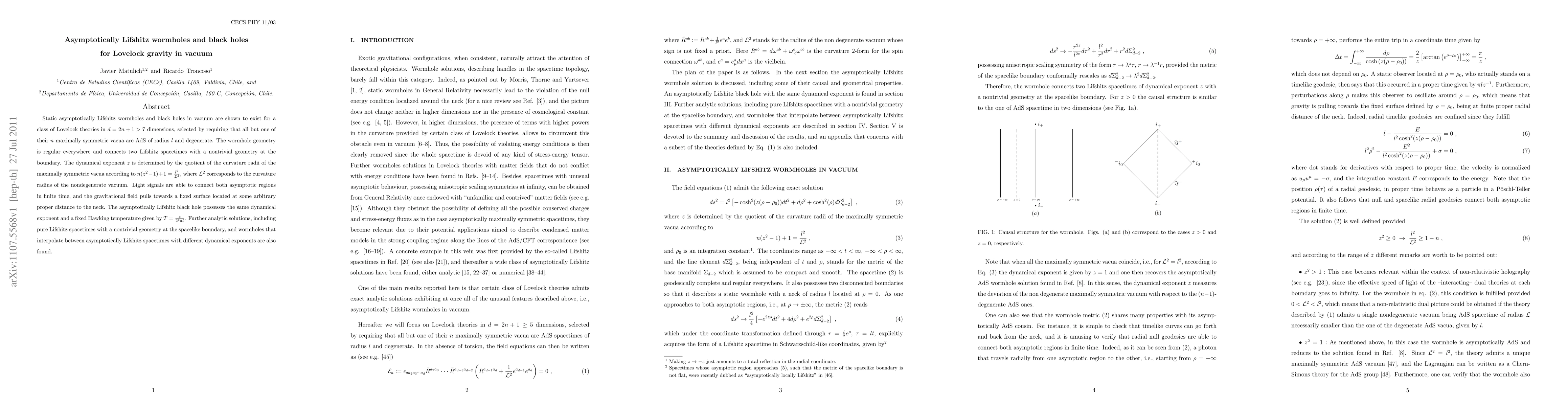 Static asymptotically Lifshitz wormholes and black holes in vacuum are shown to exist for a class of Lovelock theories in d=2n+1>7 dimensions, selected by requiring that all but one of their n maximally symmetric vacua are AdS of radius l and degenerate. The wormhole geometry is regular everywhere and connects two Lifshitz spacetimes with a nontrivial geometry at the boundary. The dynamical exponent z is determined by the quotient of the curvature radii of the maximally symmetric vacua according to n(z^2-1)+1=(l/L)^2, where L corresponds to the curvature radius of the nondegenerate vacuum. Light signals are able to connect both asymptotic regions in finite time, and the gravitational field pulls towards a fixed surface located at some arbitrary proper distance to the neck. The asymptotically Lifshitz black hole possesses the same dynamical exponent and a fixed Hawking temperature given by T=z/(2^z pi l). Further analytic solutions, including pure Lifshitz spacetimes with a nontrivial geometry at the spacelike boundary, and wormholes that interpolate between asymptotically Lifshitz spacetimes with different dynamical exponents are also found.