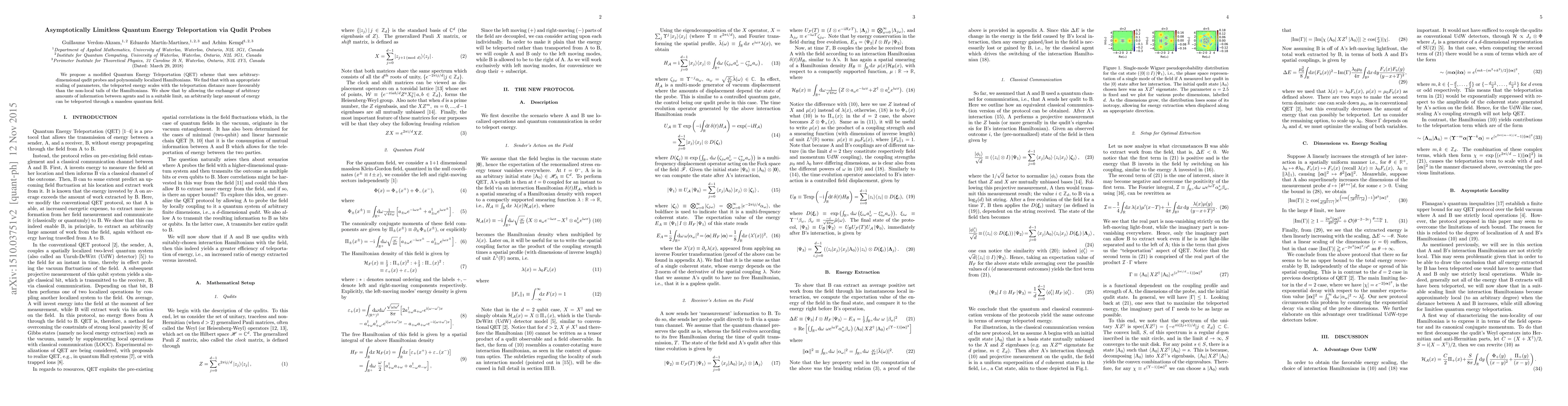 We propose a modified Quantum Energy Teleportation (QET) scheme that uses arbitrary-dimensional qudit probes and polynomially localized Hamiltonians. We find that with an appropriate scaling of parameters, the teleported energy scales with the teleportation distance more favourably than the non-local tails of the Hamiltonians. We show that by allowing the exchange of arbitrary amounts of information between agents and in a suitable limit, an arbitrarily large amount of energy can be teleported through a massless quantum field.