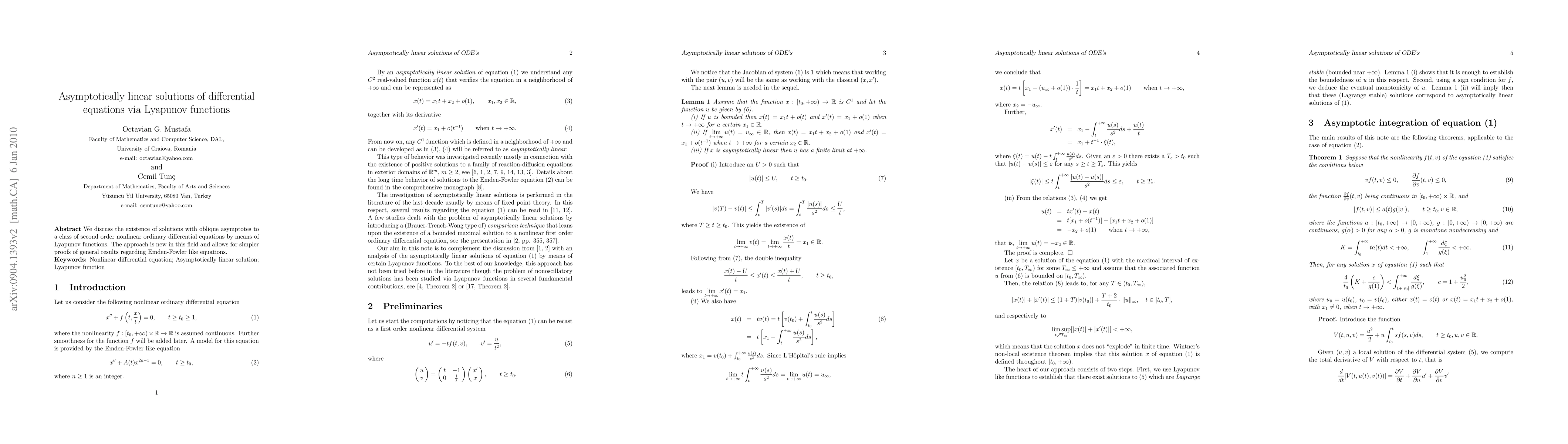 This research paper discusses the existence of solutions with oblique asymptotes to nonlinear differential equations using Lyapunov functions, offering a new approach to proving general results in the field.