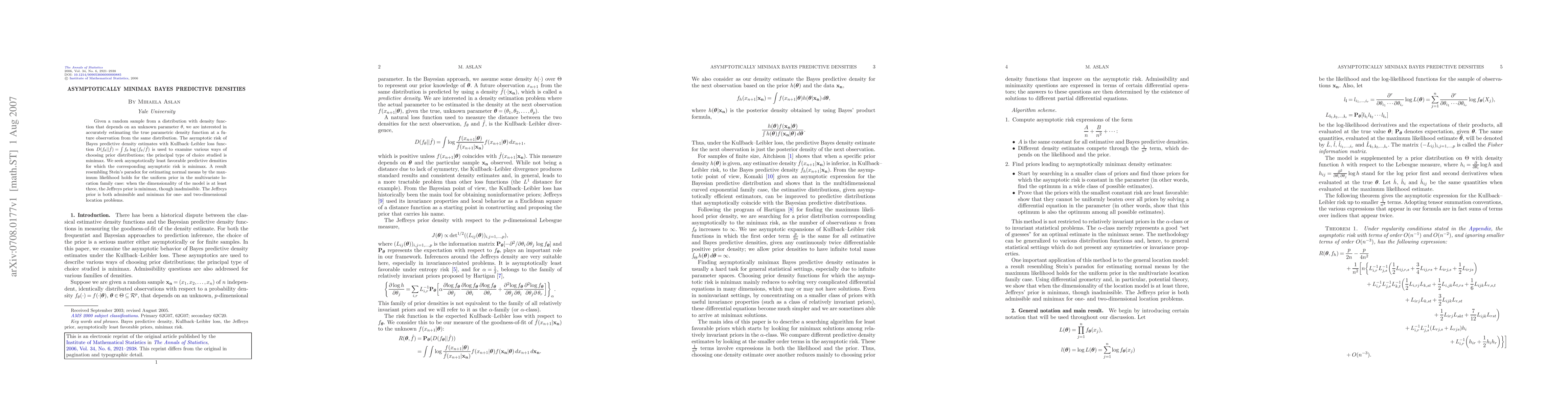 Given a random sample from a distribution with density function that depends on an unknown parameter $\theta$, we are interested in accurately estimating the true parametric density function at a future observation from the same distribution. The asymptotic risk of Bayes predictive density estimates with Kullback--Leibler loss function $D(f_{\theta}||{\hat{f}})=\int{f_{\theta} \log{(f_{\theta}/ hat{f})}}$ is used to examine various ways of choosing prior distributions; the principal type of choice studied is minimax. We seek asymptotically least favorable predictive densities for which the corresponding asymptotic risk is minimax. A result resembling Stein's paradox for estimating normal means by the maximum likelihood holds for the uniform prior in the multivariate location family case: when the dimensionality of the model is at least three, the Jeffreys prior is minimax, though inadmissible. The Jeffreys prior is both admissible and minimax for one- and two-dimensional location problems.