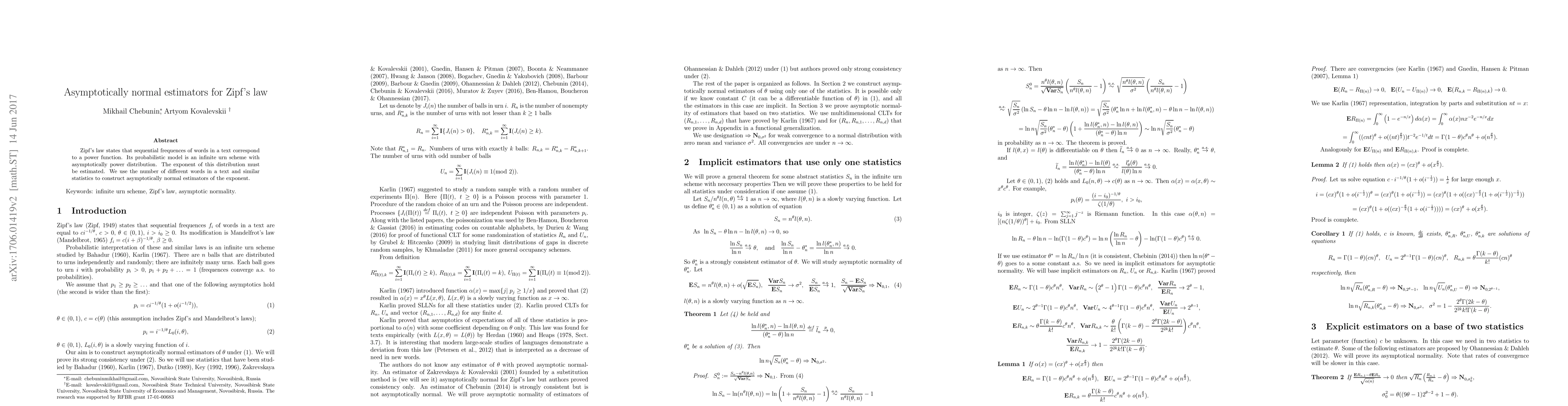 Zipf's law states that sequential frequencies of words in a text correspond to a power function. Its probabilistic model is an infinite urn scheme with asymptotically power distribution. The exponent of this distribution must be estimated. We use the number of different words in a text and similar statistics to construct asymptotically normal estimators of the exponent.