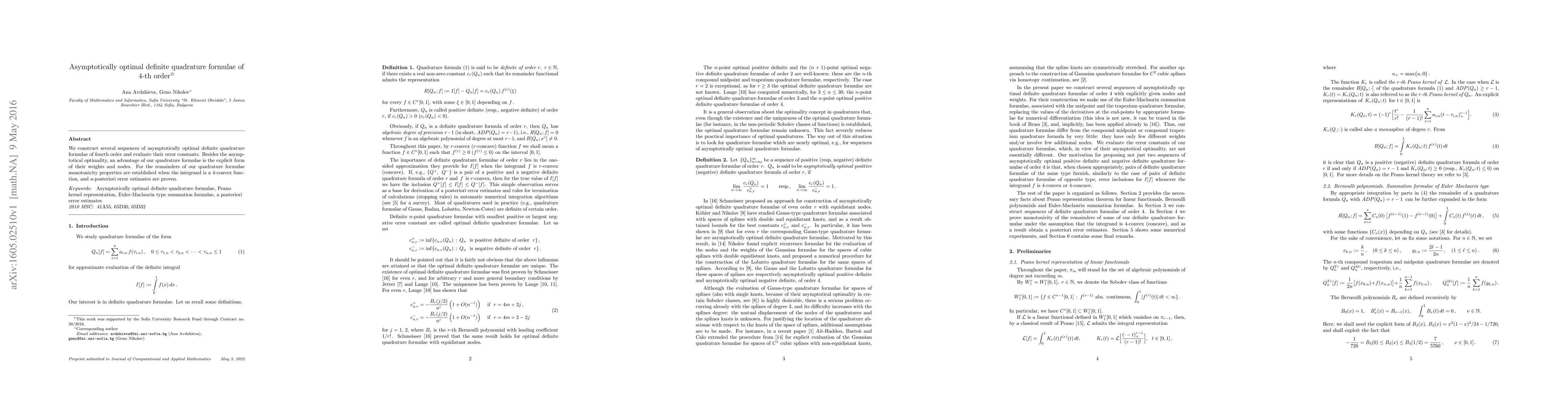 This paper constructs asymptotically optimal definite quadrature formulae of fourth order, featuring explicit weights and nodes, and establishes monotonicity properties for their remainders when the integrand is 4-convex, along with a-posteriori error estimates.