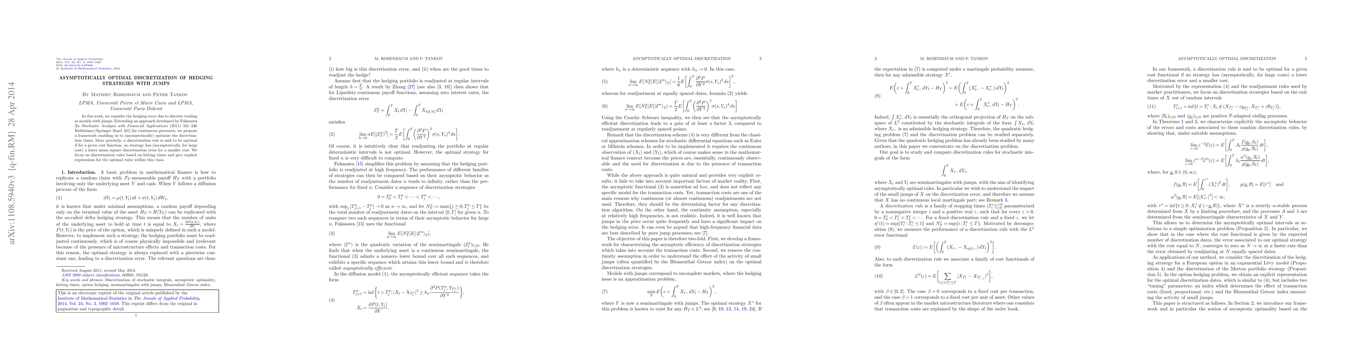 In this work, we consider the hedging error due to discrete trading in models with jumps. Extending an approach developed by Fukasawa [In Stochastic Analysis with Financial Applications (2011) 331-346 Birkh\"{a}user/Springer Basel AG] for continuous processes, we propose a framework enabling us to (asymptotically) optimize the discretization times. More precisely, a discretization rule is said to be optimal if for a given cost function, no strategy has (asymptotically, for large cost) a lower mean square discretization error for a smaller cost. We focus on discretization rules based on hitting times and give explicit expressions for the optimal rules within this class.