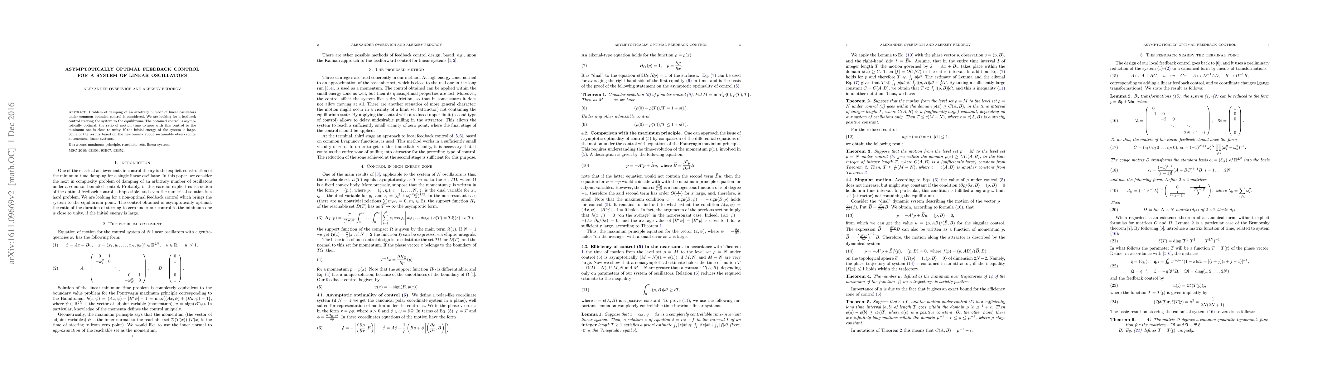Problem of damping of an arbitrary number of linear oscillators under common bounded control is considered. We are looking for a feedback control steering the system to the equilibrium. The obtained control is asymptotically optimal: the ratio of motion time to zero with this control to the minimum one is close to 1, if the initial energy of the system is large. Some of the results based on the new lemma about sustainable observability autonomous linear systems.