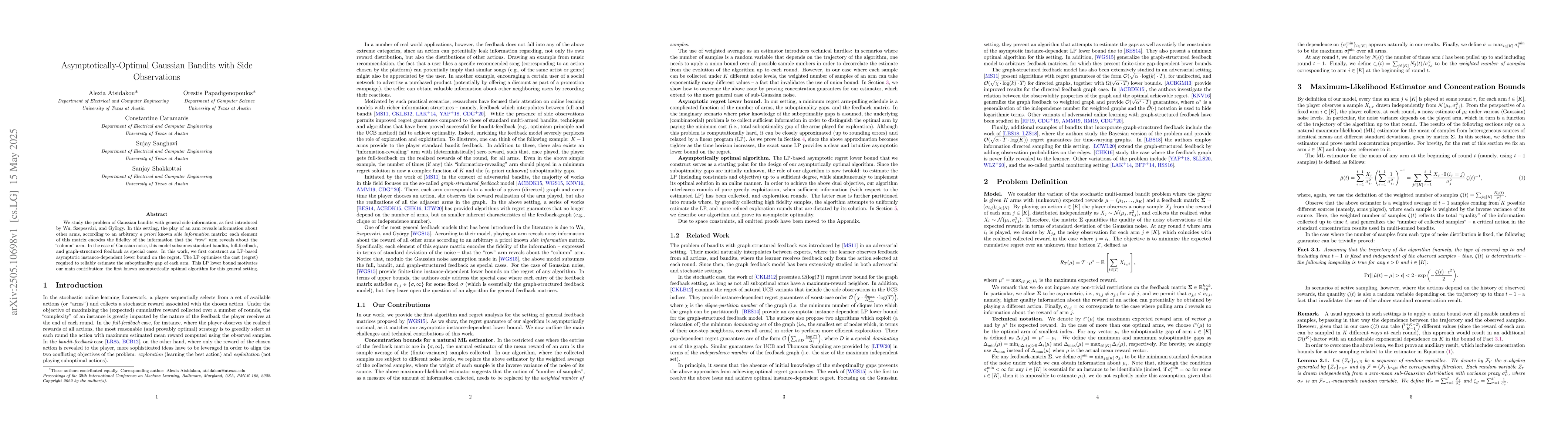 The paper constructs an LP-based asymptotic instance-dependent lower bound on the regret for Gaussian bandits with side observations, followed by proposing an asymptotically optimal algorithm for the general setting.