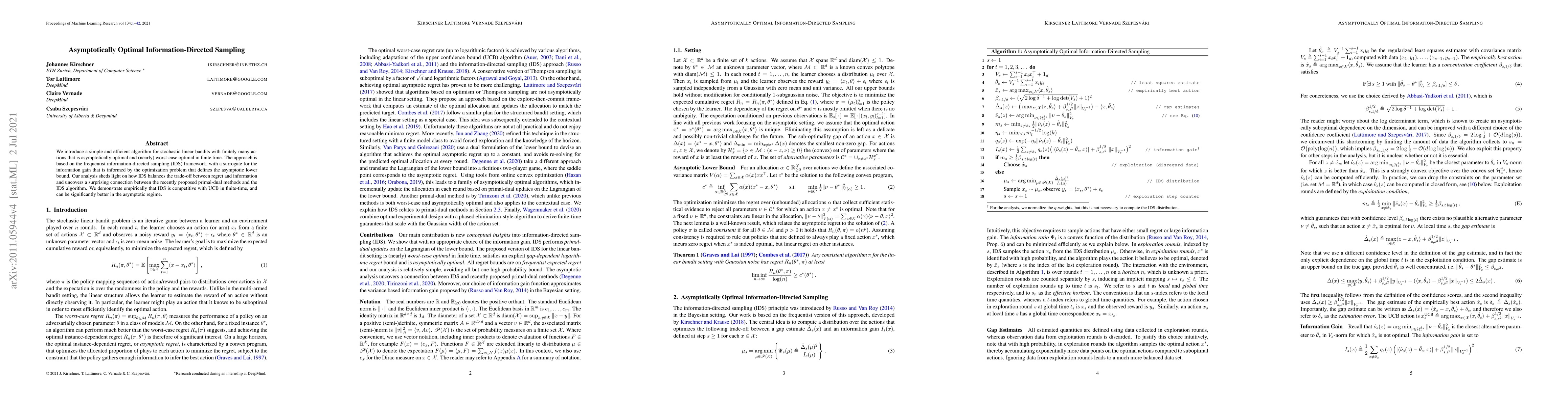 We introduce a simple and efficient algorithm for stochastic linear bandits with finitely many actions that is asymptotically optimal and (nearly) worst-case optimal in finite time. The approach is based on the frequentist information-directed sampling (IDS) framework, with a surrogate for the information gain that is informed by the optimization problem that defines the asymptotic lower bound. Our analysis sheds light on how IDS balances the trade-off between regret and information and uncovers a surprising connection between the recently proposed primal-dual methods and the IDS algorithm. We demonstrate empirically that IDS is competitive with UCB in finite-time, and can be significantly better in the asymptotic regime.