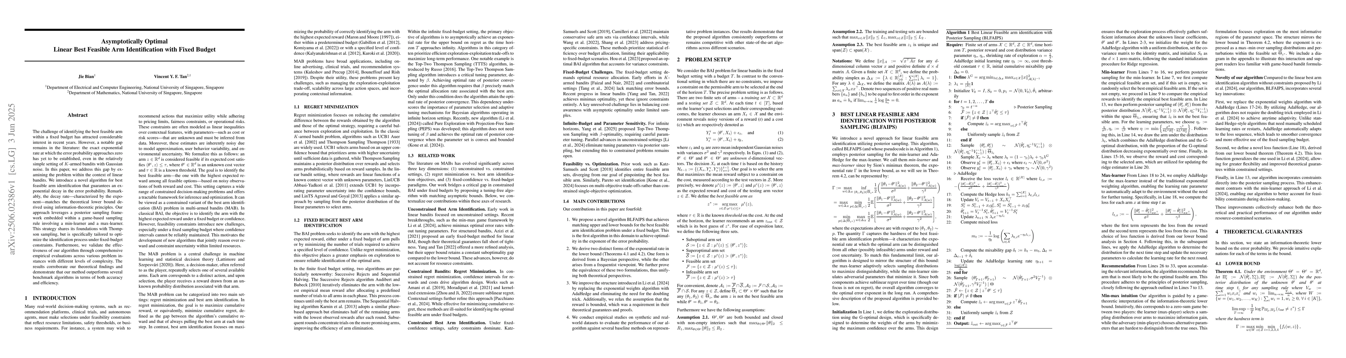 The paper presents an innovative algorithm for best feasible arm identification in linear bandits with fixed budget, ensuring an exponential decay rate in error probability that matches the theoretical lower bound.