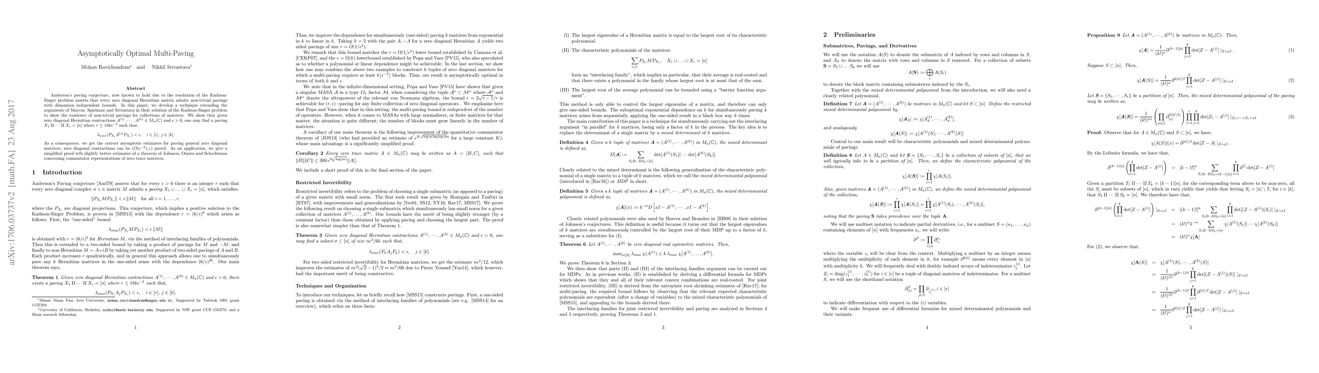Anderson's paving conjecture, now known to hold due to the resolution of the Kadison-Singer problem asserts that every zero diagonal Hermitian matrix admits non-trivial pavings with dimension independent bounds. In this paper, we develop a technique extending the arguments of Marcus, Spielman and Srivastava in their solution of the Kadison-Singer problem to show the existence of non-trivial pavings for collections of matrices. We show that given zero diagonal Hermitian contractions $A^{(1)}, \cdots, A^{(k)} \in M_n(\mathbb{C})$ and $\epsilon > 0$, one may find a paving $X_1 \amalg \cdots \amalg X_r = [n]$ where $r \leq 18k\epsilon^{-2}$ such that, \[\lambda_{max} (P_{X_i} A^{(j)} P_{X_i}) < \epsilon, \quad i \in [r], \, j \in [k].\] As a consequence, we get the correct asymptotic estimates for paving general zero diagonal matrices; zero diagonal contractions can be $(O(\epsilon^{-2}),\epsilon)$ paved. As an application, we give a simplified proof wth slightly better estimates of a theorem of Johnson, Ozawa and Schechtman concerning commutator representations of zero trace matrices.