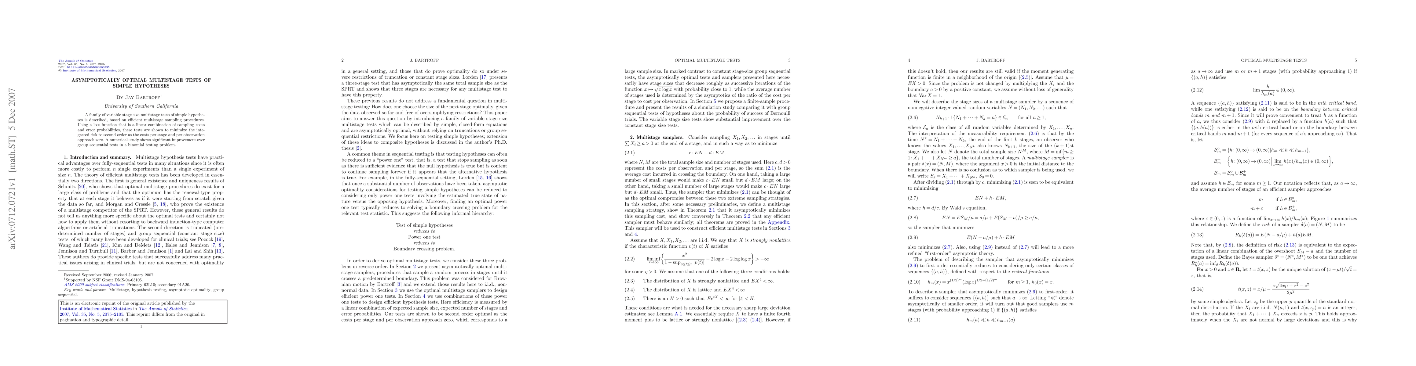 This paper introduces a family of multistage tests for simple hypotheses, demonstrating their asymptotic optimality based on efficient multistage sampling. These tests minimize integrated risk to second order, showing significant improvement over group sequential tests in binomial testing scenarios.