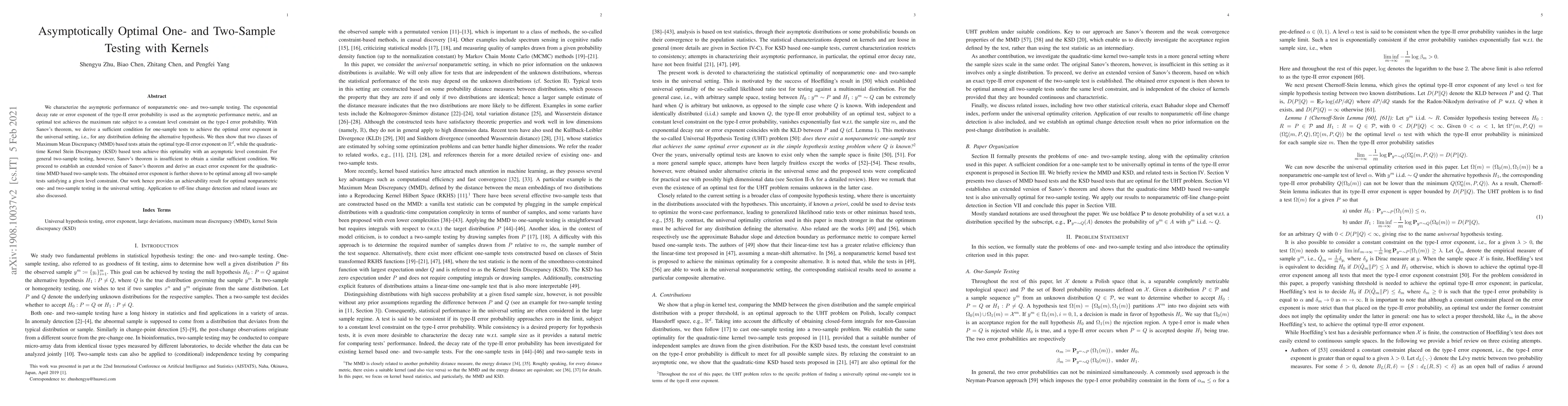 This paper explores the asymptotic performance of nonparametric one- and two-sample testing, focusing on achieving optimal error exponents. It establishes sufficient conditions for optimal one-sample tests and shows that Maximum Mean Discrepancy (MMD) based tests achieve the optimal error exponent in two-sample settings, with an extended version of Sanov's theorem providing the necessary theoretical foundation.