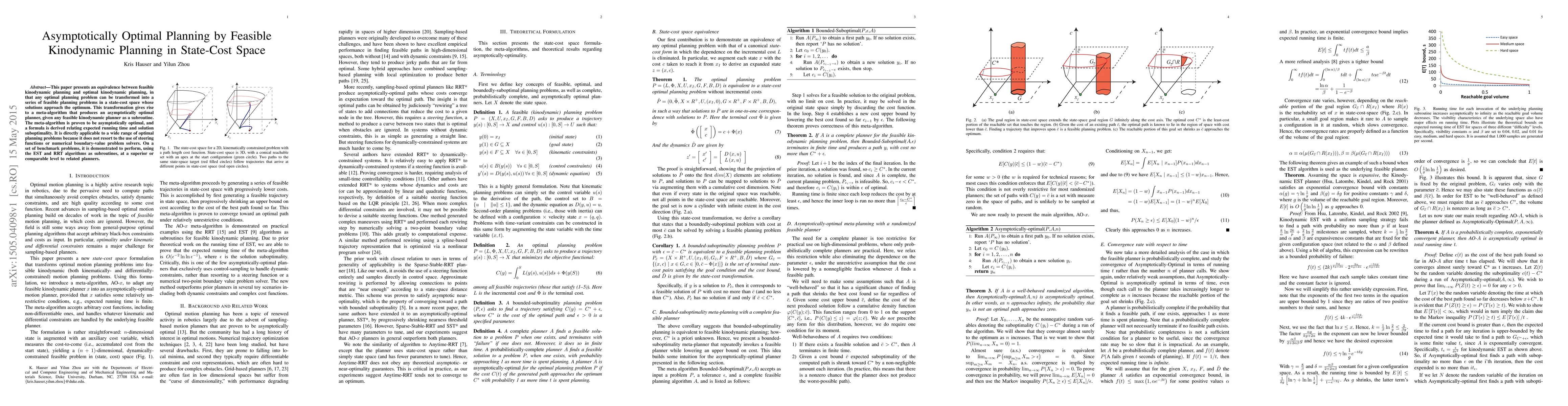 This paper presents an equivalence between feasible kinodynamic planning and optimal kinodynamic planning, in that any optimal planning problem can be transformed into a series of feasible planning problems in a state-cost space whose solutions approach the optimum. This transformation gives rise to a meta-algorithm that produces an asymptotically optimal planner, given any feasible kinodynamic planner as a subroutine. The meta-algorithm is proven to be asymptotically optimal, and a formula is derived relating expected running time and solution suboptimality. It is directly applicable to a wide range of optimal planning problems because it does not resort to the use of steering functions or numerical boundary-value problem solvers. On a set of benchmark problems, it is demonstrated to perform, using the EST and RRT algorithms as subroutines, at a superior or comparable level to related planners.
