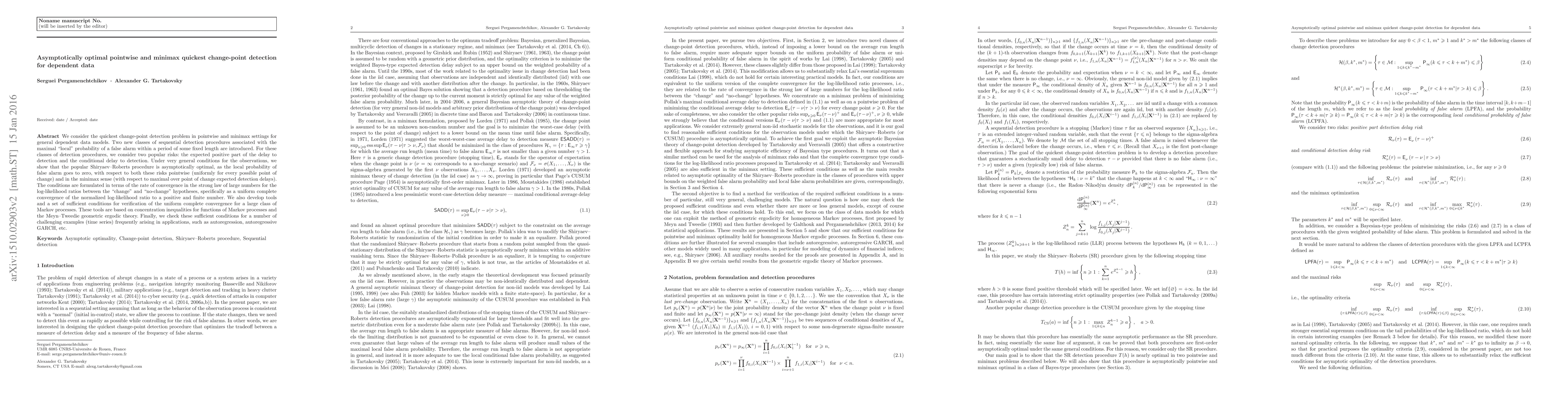 We consider the quickest change-point detection problem in pointwise and minimax settings for general dependent data models. Two new classes of sequential detection procedures associated with the maximal "local" probability of a false alarm within a period of some fixed length are introduced. For these classes of detection procedures, we consider two popular risks: the expected positive part of the delay to detection and the conditional delay to detection. Under very general conditions for the observations, we show that the popular Shiryaev--Roberts procedure is asymptotically optimal, as the local probability of false alarm goes to zero, with respect to both these risks pointwise (uniformly for every possible point of change) and in the minimax sense (with respect to maximal over point of change expected detection delays). The conditions are formulated in terms of the rate of convergence in the strong law of large numbers for the log-likelihood ratios between the "change" and "no-change" hypotheses, specifically as a uniform complete convergence of the normalized log-likelihood ratio to a positive and finite number. We also develop tools and a set of sufficient conditions for verification of the uniform complete convergence for a large class of Markov processes. These tools are based on concentration inequalities for functions of Markov processes and the Meyn--Tweedie geometric ergodic theory. Finally, we check these sufficient conditions for a number of challenging examples (time series) frequently arising in applications, such as autoregression, autoregressive GARCH, etc.
