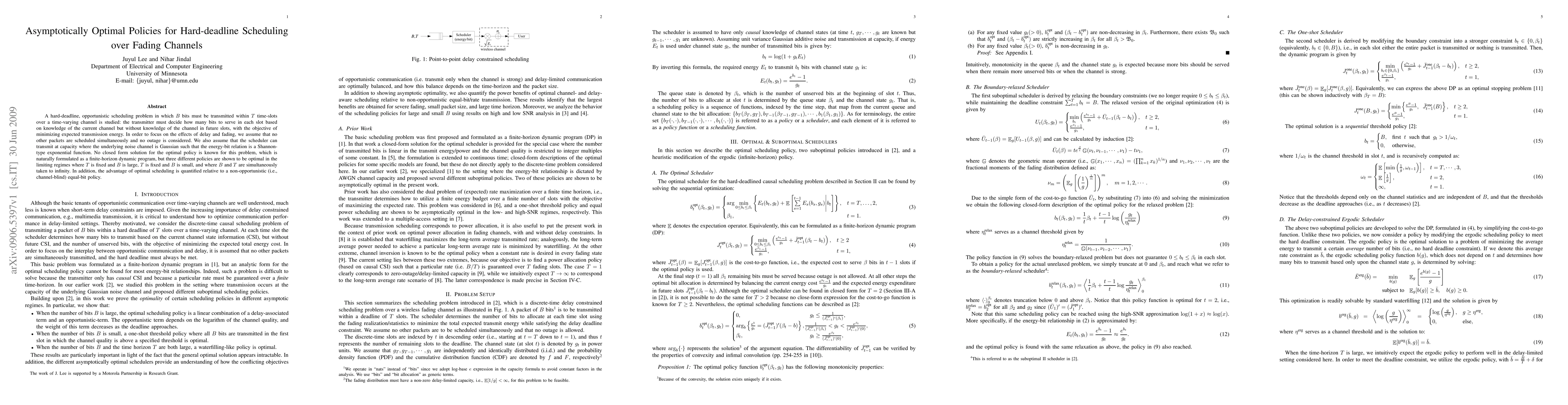 This paper studies hard-deadline scheduling over fading channels to minimize transmission energy, proposing optimal policies for different large-scale regimes. It quantifies the benefits of optimal scheduling compared to a channel-blind approach.