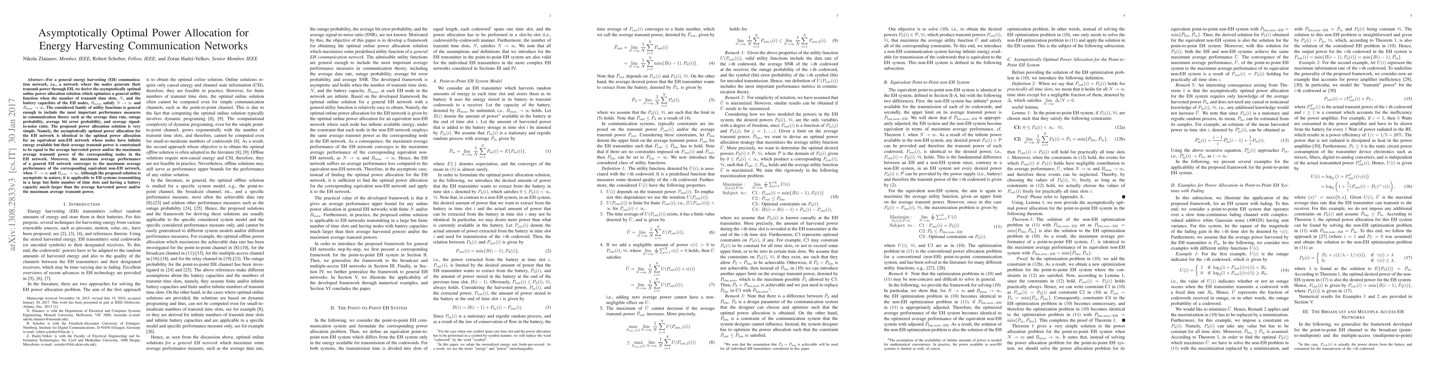 This paper derives an asymptotically optimal online power allocation strategy for energy harvesting communication networks, showing that the optimal power allocation in large networks converges to that of equivalent non-energy harvesting networks with infinite energy but constrained average transmit power. The solution applies to large but finite time slots and sufficiently large battery capacities.