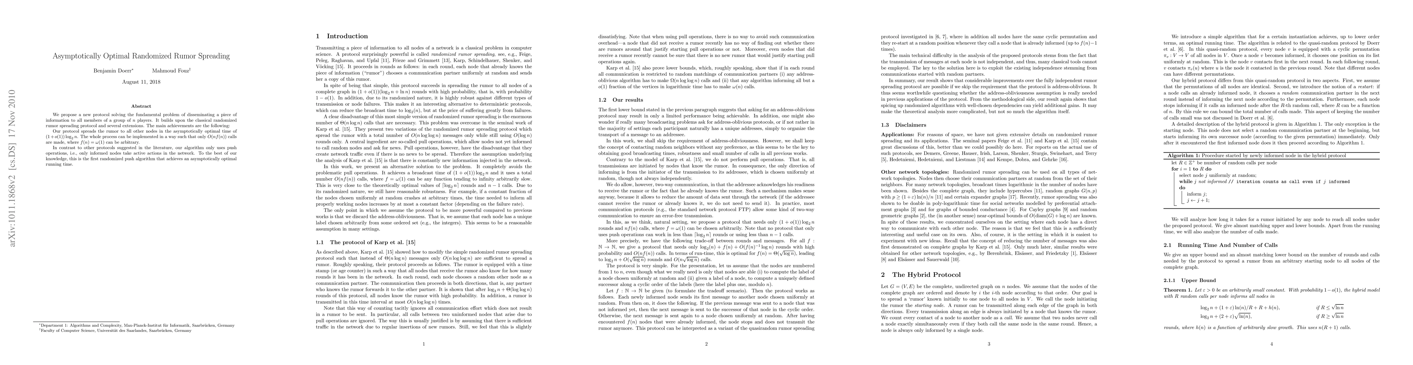 We propose a new protocol solving the fundamental problem of disseminating a piece of information to all members of a group of n players. It builds upon the classical randomized rumor spreading protocol and several extensions. The main achievements are the following: Our protocol spreads the rumor to all other nodes in the asymptotically optimal time of (1 + o(1)) \log_2 n. The whole process can be implemented in a way such that only O(n f(n)) calls are made, where f(n)= \omega(1) can be arbitrary. In contrast to other protocols suggested in the literature, our algorithm only uses push operations, i.e., only informed nodes take active actions in the network. To the best of our knowledge, this is the first randomized push algorithm that achieves an asymptotically optimal running time.