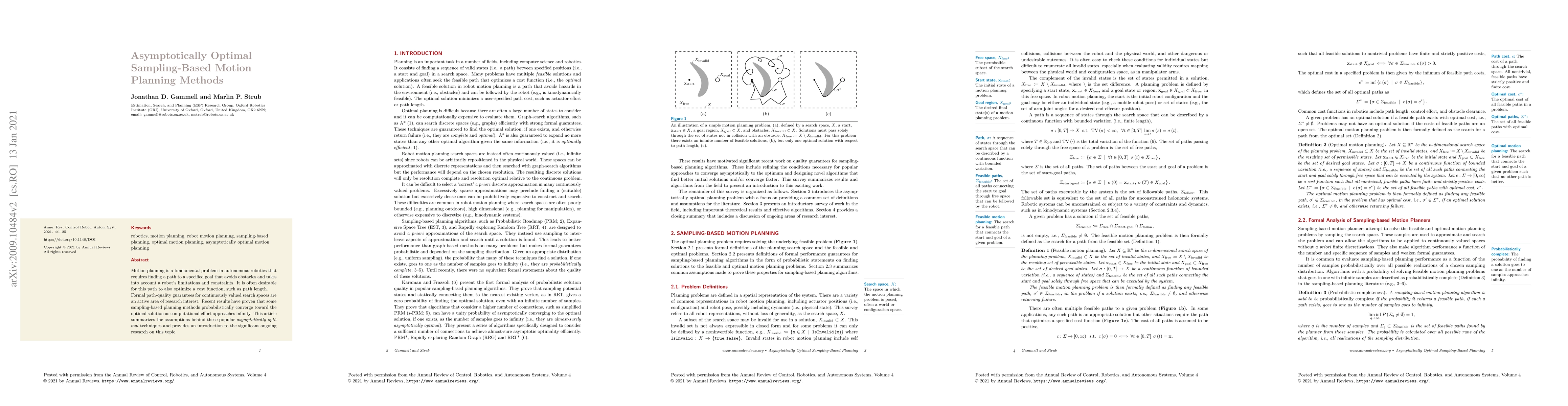 This paper surveys asymptotically optimal sampling-based motion planning methods for autonomous robotics, focusing on techniques that probabilistically converge to the optimal solution as computational resources increase. It highlights the assumptions behind these methods and discusses ongoing research in this area.
