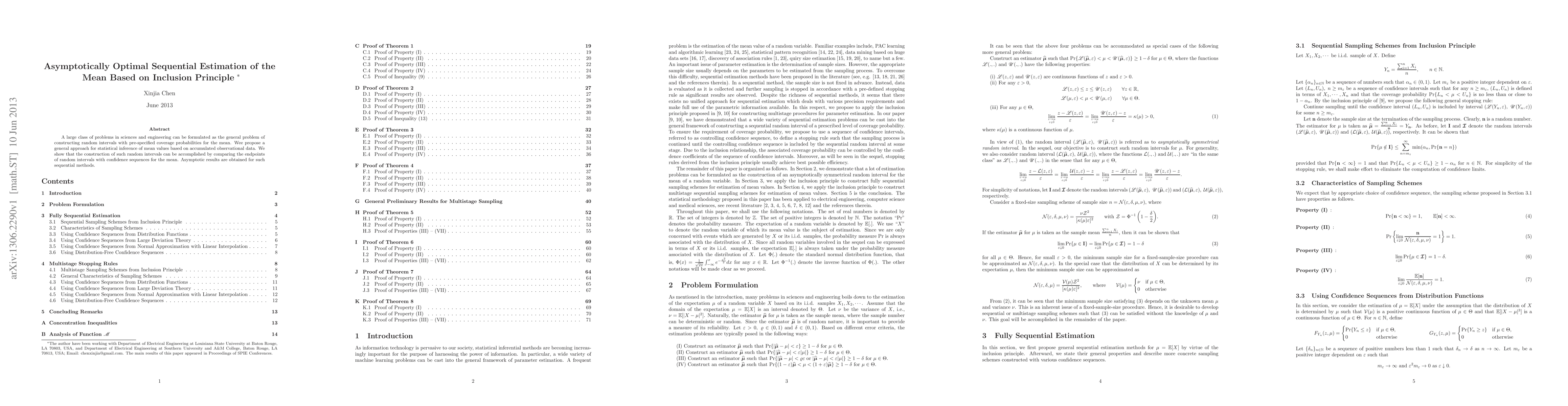 This paper proposes a method for asymptotically optimal sequential estimation of the mean using the inclusion principle, demonstrating how to construct random intervals with pre-specified coverage probabilities based on accumulated observational data and confidence sequences. Asymptotic results for the effectiveness of these sequential methods are provided.