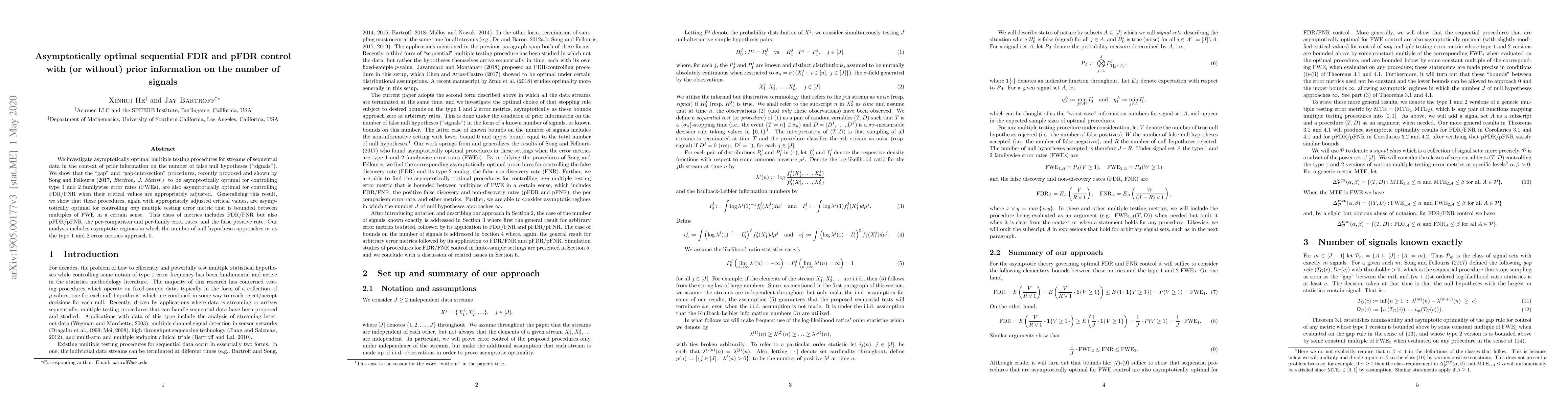 We investigate asymptotically optimal multiple testing procedures for streams of sequential data in the context of prior information on the number of false null hypotheses ("signals"). We show that the "gap" and "gap-intersection" procedures, recently proposed and shown by Song and Fellouris (2017, Electron. J. Statist.) to be asymptotically optimal for controlling type 1 and 2 familywise error rates (FWEs), are also asymptotically optimal for controlling FDR/FNR when their critical values are appropriately adjusted. Generalizing this result, we show that these procedures, again with appropriately adjusted critical values, are asymptotically optimal for controlling any multiple testing error metric that is bounded between multiples of FWE in a certain sense. This class of metrics includes FDR/FNR but also pFDR/pFNR, the per-comparison and per-family error rates, and the false positive rate. Our analysis includes asymptotic regimes in which the number of null hypotheses approaches $\infty$ as the type 1 and 2 error metrics approach $0$.