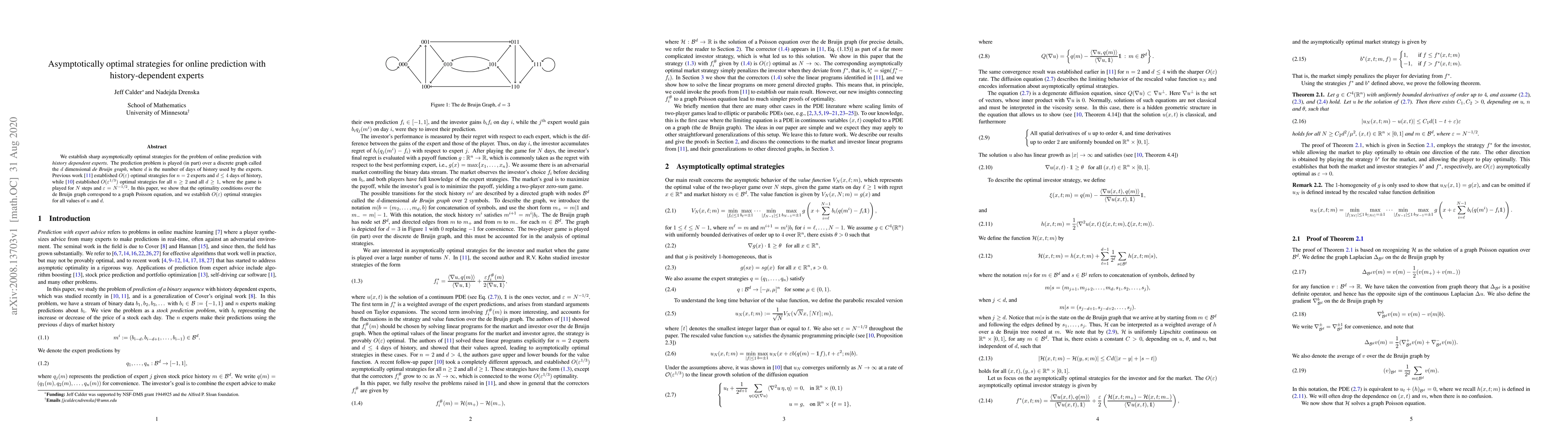 We establish sharp asymptotically optimal strategies for the problem of online prediction with history dependent experts. The prediction problem is played (in part) over a discrete graph called the $d$ dimensional de Bruijn graph, where $d$ is the number of days of history used by the experts. Previous work [11] established $O(\varepsilon)$ optimal strategies for $n=2$ experts and $d\leq 4$ days of history, while [10] established $O(\varepsilon^{1/3})$ optimal strategies for all $n\geq 2$ and all $d\geq 1$, where the game is played for $N$ steps and $\varepsilon=N^{-1/2}$. In this paper, we show that the optimality conditions over the de Bruijn graph correspond to a graph Poisson equation, and we establish $O(\varepsilon)$ optimal strategies for all values of $n$ and $d$.