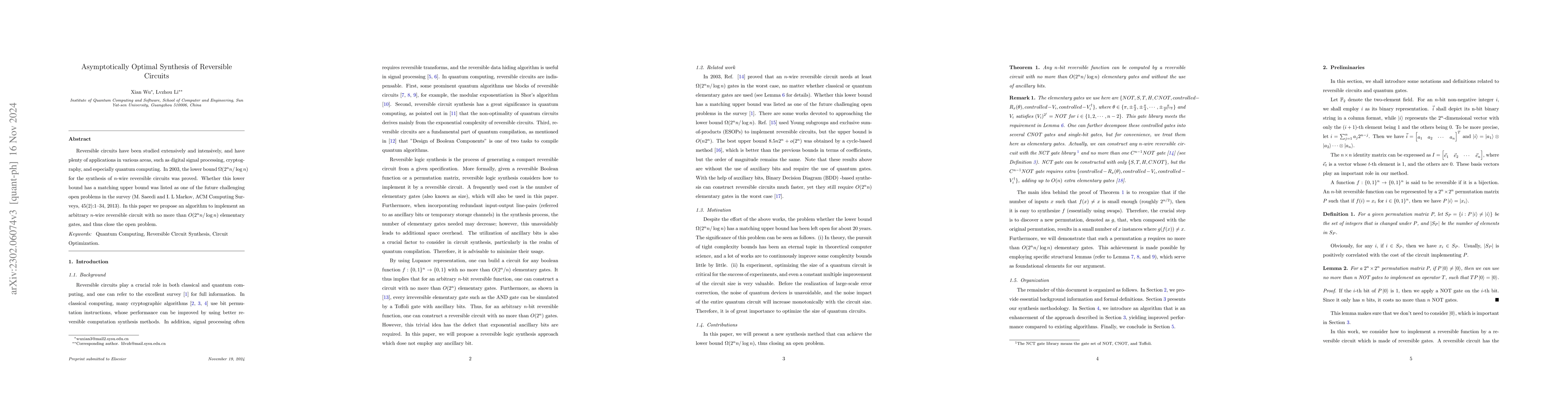 The paper contributes a novel algorithm for synthesizing reversible circuits with an asymptotically optimal upper bound, matching the known lower bound.